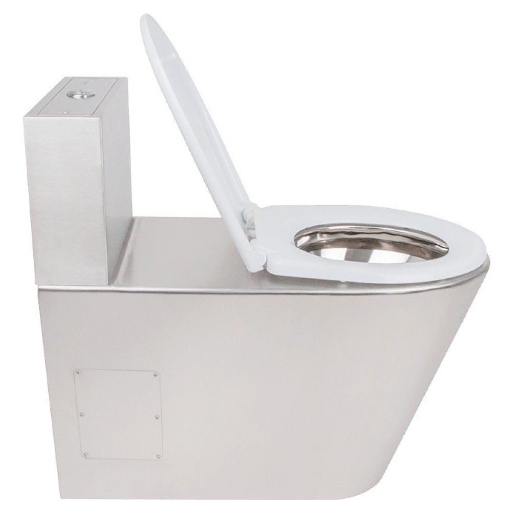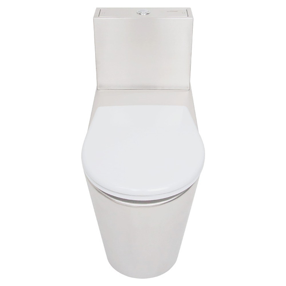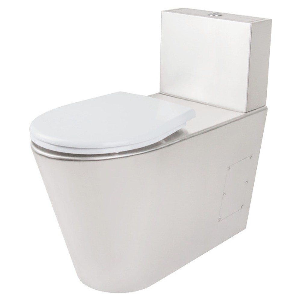 Напольный унитаз-компакт Oceanus 1-010.1(P) используется в санитарных узлах предприятий общественного питания и торговли, вокзалов, автозаправок и других мест массового пользования. Модель оснащена сливным бачком и закрытым нисходящим к основанию кожухом с боковыми отверстиями со съемными панелями для удобства технического обслуживания. Корпус выполнен из высококачественной нержавеющей стали марки AISI 304 серебристого оттенка с матовой поверхностью, сиденье – из белого пластика.