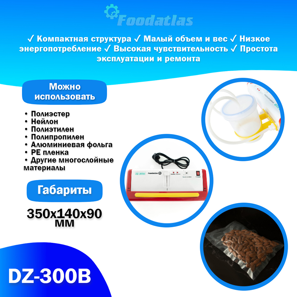 Бескамерный вакуумный упаковщик Foodatlas DZ-300B Pro используется на предприятиях пищевой промышленности, общественного питания и торговли для упаковки в вакуум продуктов питания, жидкости, готовых блюд, продуктов химической промышленности и медикаментов для увеличения срока хранения. Модель оснащена механической панелью управления и функцией удаления жидкости. Для упаковки используются ПЭТ, ПЭ нейлоновая и алюминиевая ленты.