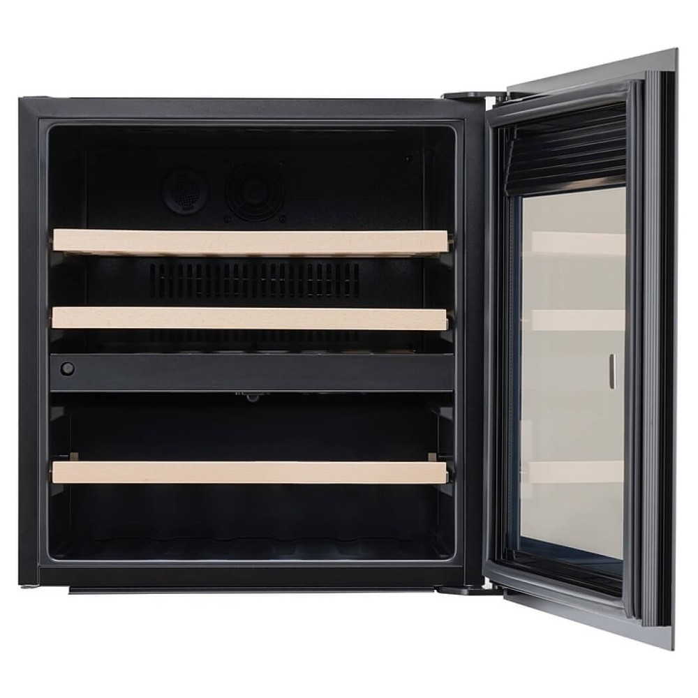 В комплект поставки входят 3 съемные полки с направляющими для размещения бутылок, набор крепежа, инструкция по эксплуатации, гарантийный талон и заводская упаковка.