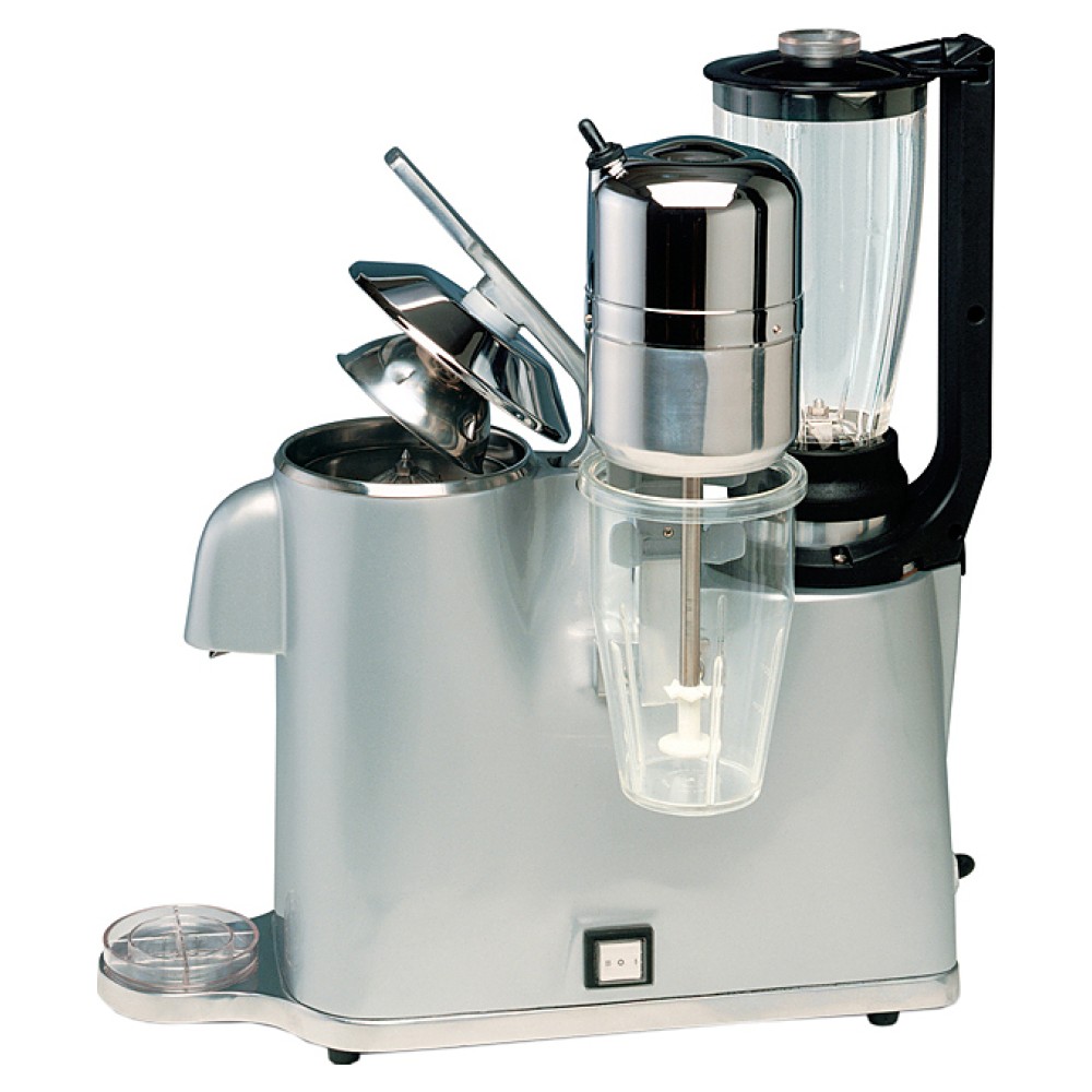 Барный комбайн Vema GR 2021 объединяет в себе функции блендера, соковыжималки и миксера для молочных коктейлей и используется на предприятиях общественного питания и торговли. Модель оснащена электромеханической системой управления и 2-х скоростным двигателем блендера. Корпус выполнен из окрашенного алюминия, конус соковыжималки и нож с 4 лезвиями блендера - из нержавеющей стали, стакан и крышка - из поликарбоната.