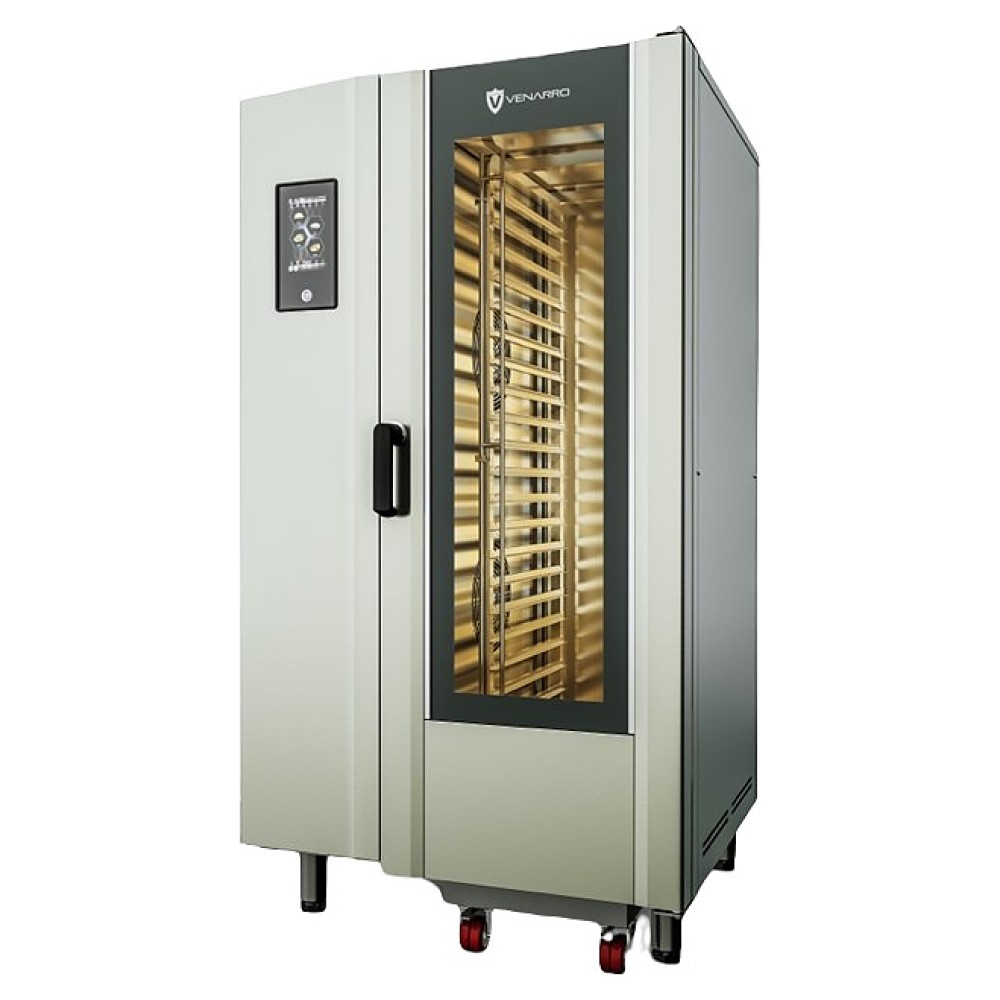 Конвекционная печь Venarro ROCCIA DEF-DK20D предназначена для выпекания или разогрева кондитерских и хлебобулочных изделий, различных блюд, замороженных или предварительно выдержанных в расстоечном шкафу заготовок из теста на предприятиях общественного питания и торговли. Модель оснащена сенсорной панелью управления с емкостным цветным сенсорным TFT-экраном и дверной системой с датчиками. Корпус выполнен из нержавеющей стали.