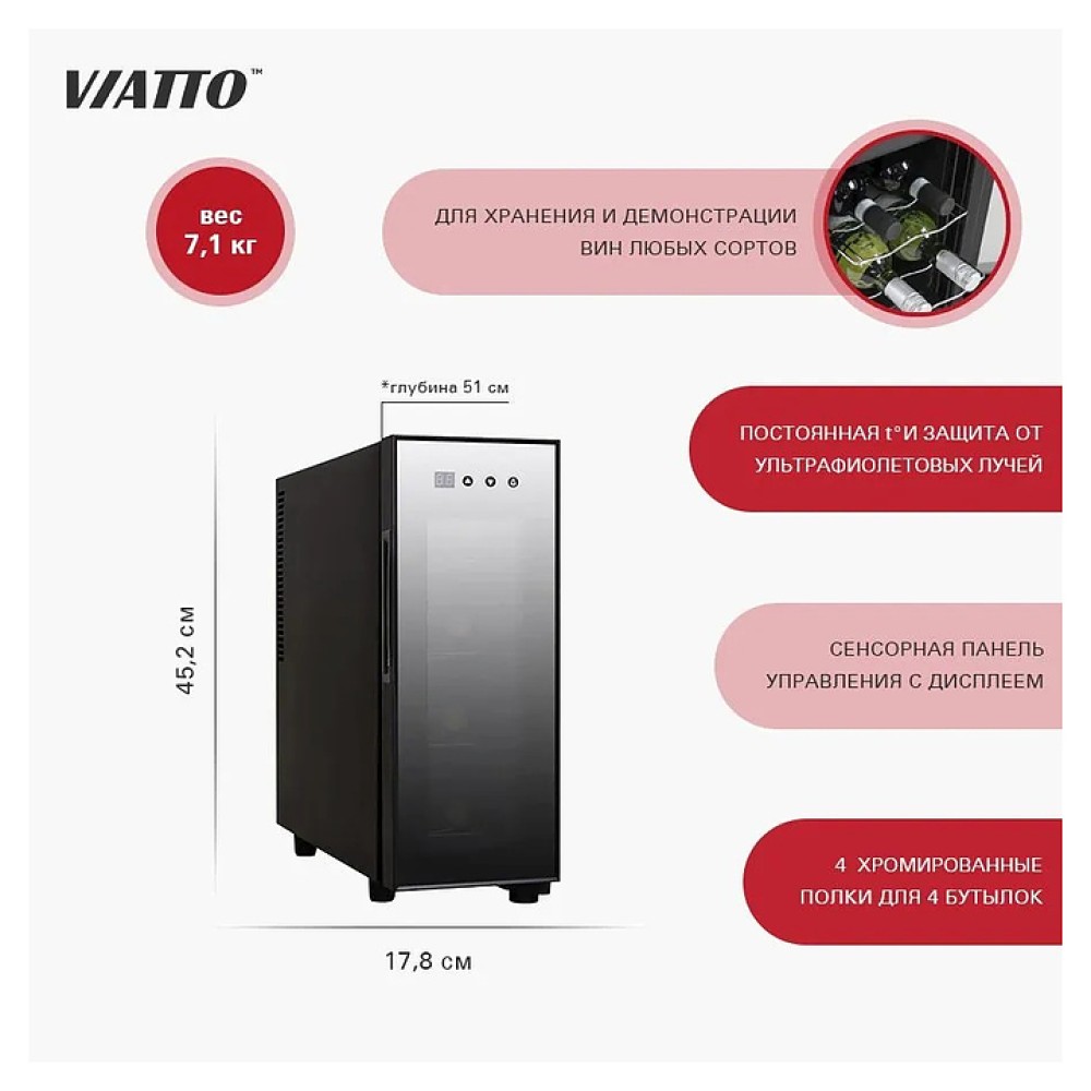 Винный шкаф VIATTO VA-JC33 предназначен для демонстрации, охлаждения и хранения винных напитков на предприятиях торговли, общественного питания, в коттеджах и частных домах. Модель оснащена 4 полками. Корпус выполнен из окрашенной в черный цвет стали, дверь - из тонированного стекла в раме из нержавеющей стали.
