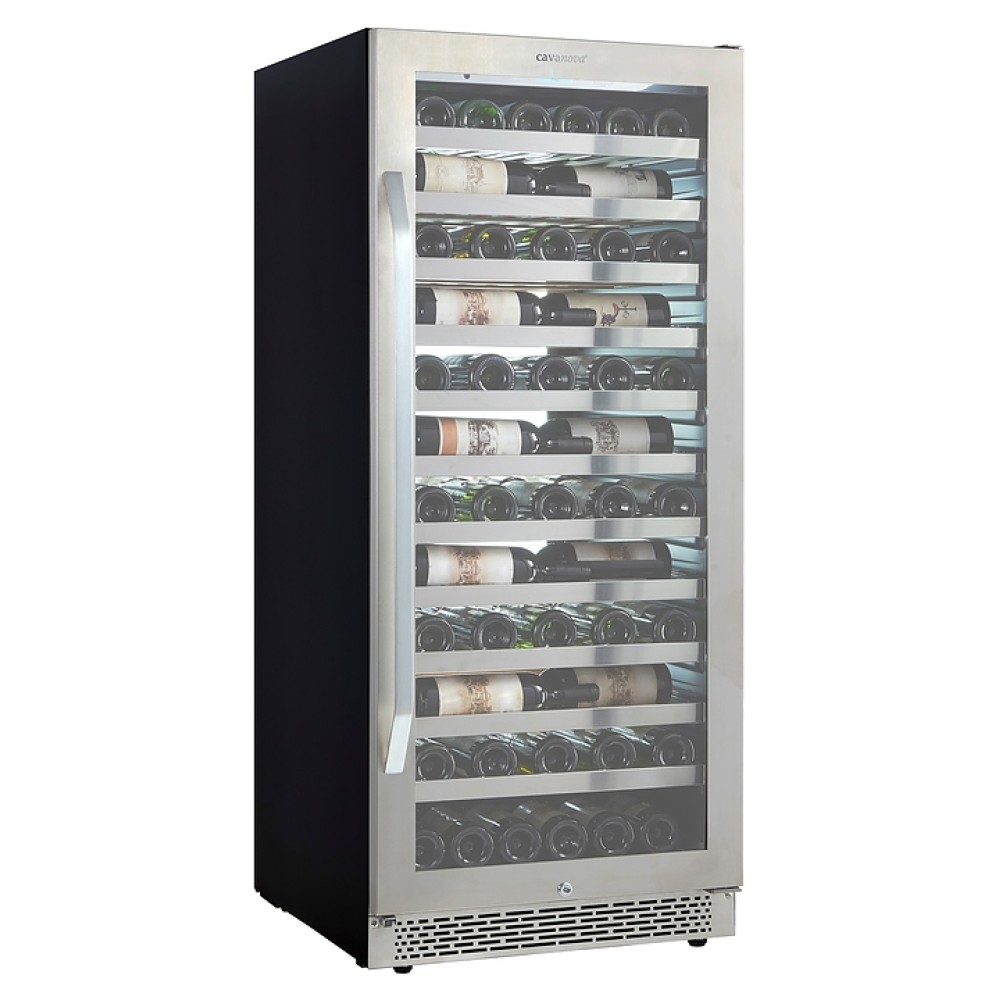 Винный шкаф Cavanova CV102-1TL предназначен для хранения при оптимальных условиях и демонстрации бутилированного вина различных сортов в барах, ресторанах, специализированных магазинах, подсобных складских помещениях, а также в домашних условиях. Модель оснащена монотемпературной холодильной камерой, правосторонней распашной дверью с длинной вертикальной рукояткой, прозрачным обзорным остеклением, цокольной решеткой и расположенной за дверью в верхней части фронта сенсорной панелью управления с жидкокристаллическим дисплеем индикации. Корпус выполнен из металла с антикоррозийным покрытием черного цвета, фронт рамы двери и рукоятка с поверхностью серебристого оттенка, полки – из массива древесины.