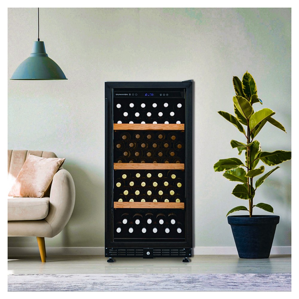 Винный шкаф Dunavox DX-107.229K серии Horeca предназначен для демонстрации, хранения и создания оптимальных условий для сохранения всех вкусовых свойств вина в бутылках на предприятиях общественного питания, торговли, в барах, ресторанах, специализированных магазинах, частных домах или квартирах. Модель оснащена сенсорной панелью управления и синей LED-подсветкой, дверным замком. Дверь выполнена из рамы черного цвета и тонированного стекла с защитой от ультрафиолетовых лучей, выдвижные полки - из нелакированного сапеле (древесина).