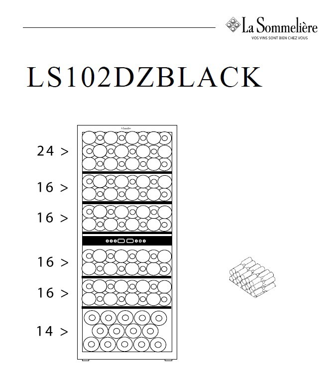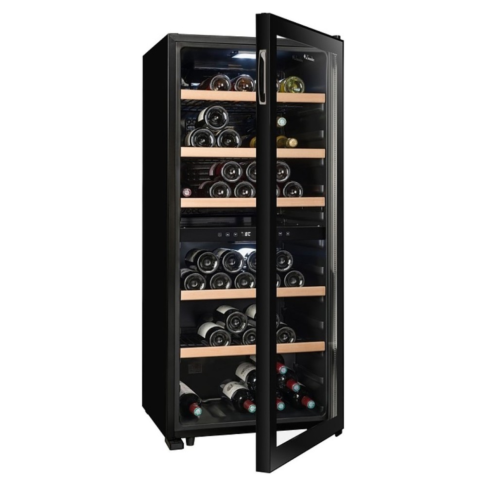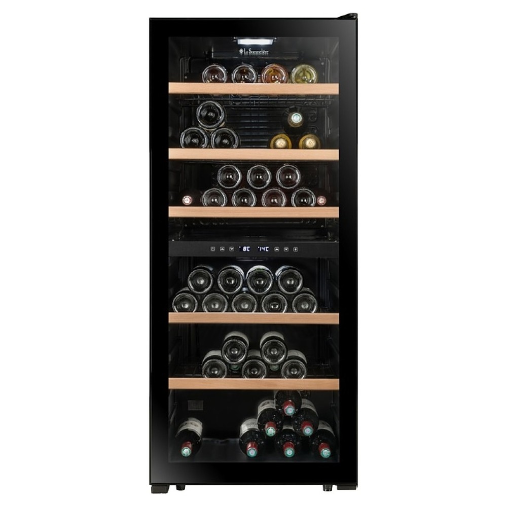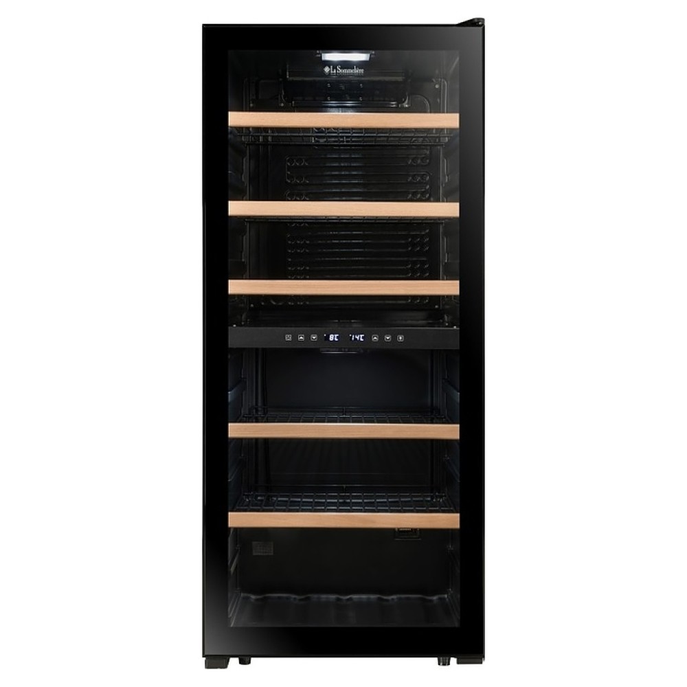 Винный шкаф La Sommeliere LS102DZBLACK предназначен для хранения при оптимальных условиях и демонстрации бутилированного вина различных сортов в барах, ресторанах, специализированных магазинах, складских помещениях, а также домашних условиях. Модель оснащена холодильной камерой с 2 независимыми температурными зонами, правосторонней перенавешиваемой распашной дверью на внешних петлях, обзорным остеклением, кабелем питания с вилкой, расположенной внутри камеры панелью управления с сенсорными клавишами и цифровым дисплеем индикации. Корпус и рама двери выполнены из металла с антикоррозийным покрытием черного цвета, внутренняя облицовка камеры черного цвета, полки – из стали с фасадом из массива буковой древесины.