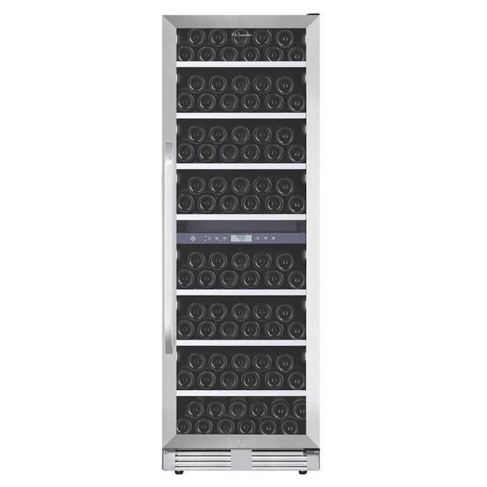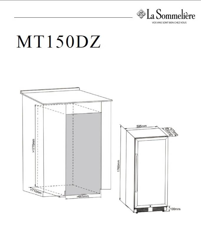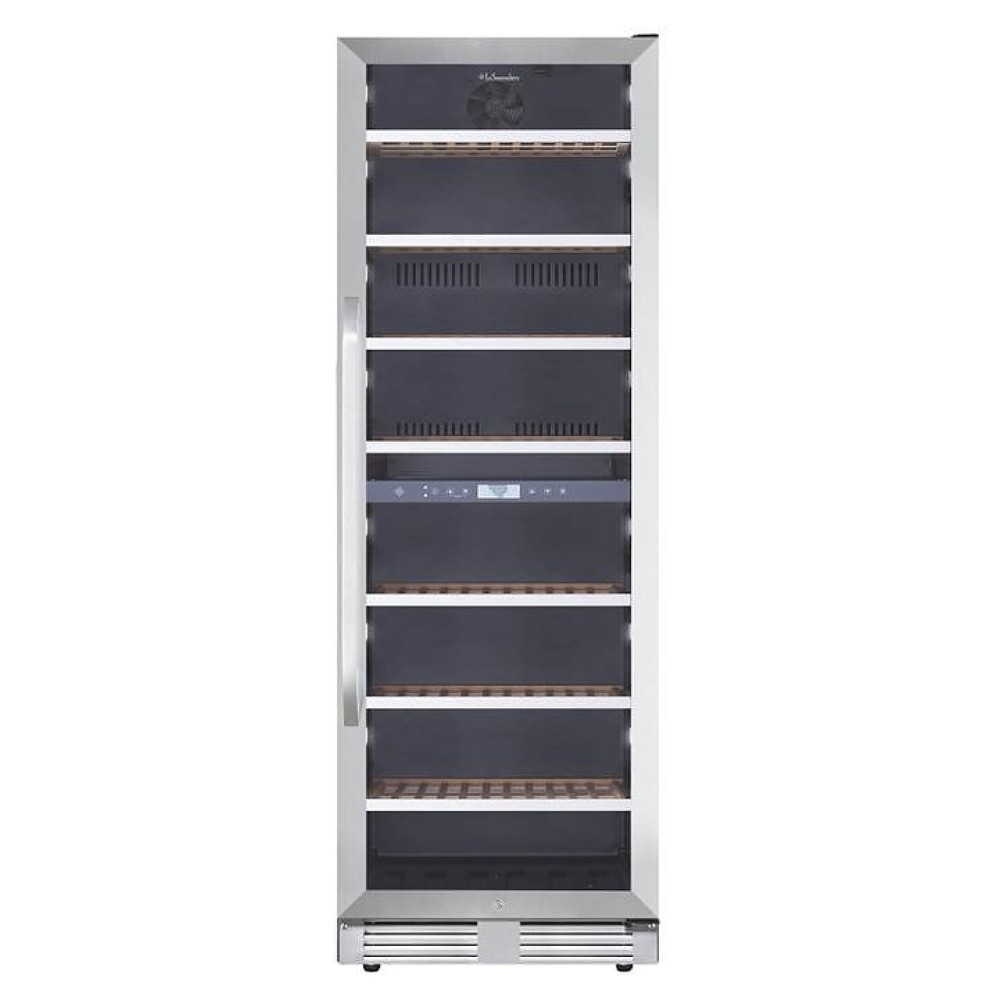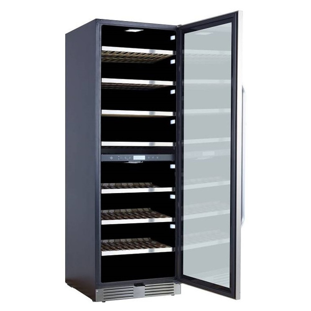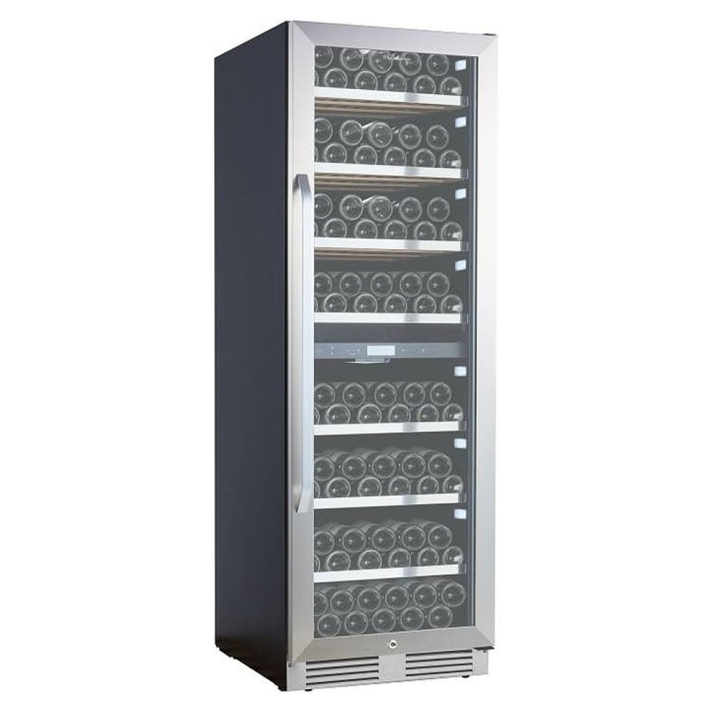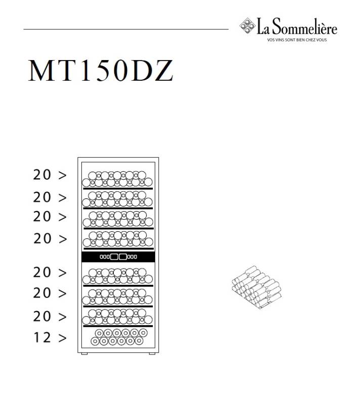 Винный шкаф La Sommeliere MT150DZ предназначен для хранения бутилированного вина в ресторанах, специализированных магазинах, подсобных складских помещениях, в частных домах или квартирах. Модель оснащена 2 независимыми температурными отсеками, сенсорным цифровым дисплеем, боковым и потолочным освещением, 7 полками, съемной вентиляционной решеткой, замком и 4 регулируемыми ножками. Дверь выполнена из стеклопакета с УФ защитой, полки - из дерева с фасадом из нержавеющей стали.
