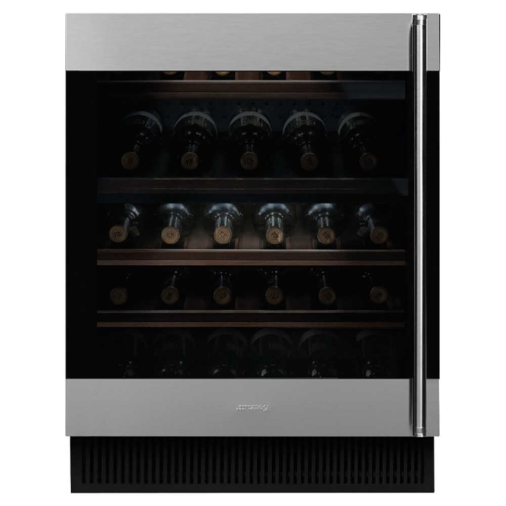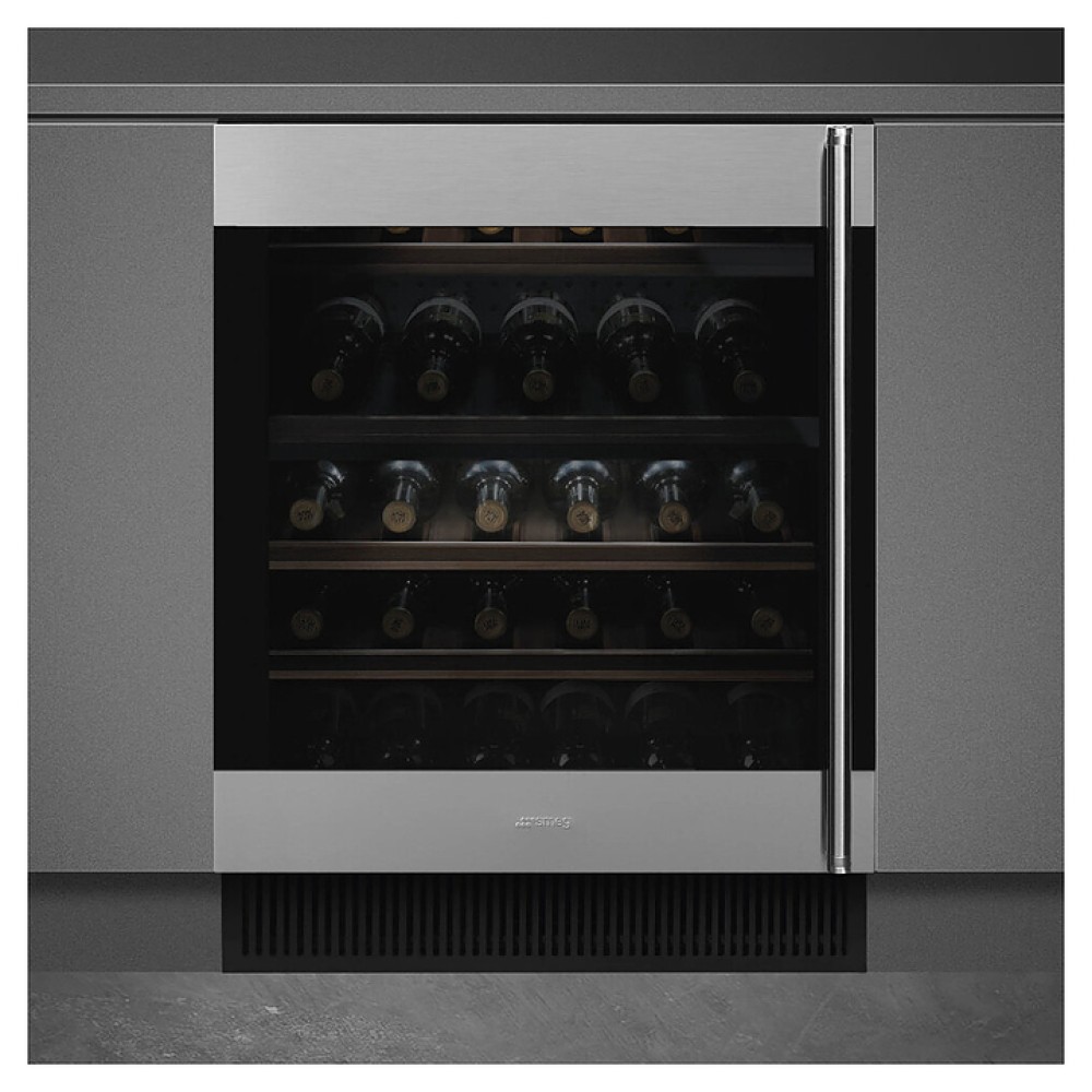 Винный шкаф SMEG CVI338LX3 предназначен для охлаждения, хранения при оптимальных условиях и демонстрации бутилированного вина различных сортов в гостиницах и домашних условиях. Модель оснащена холодильной камерой с 2 температурными зонами, 2 интегрированными в основания стационарными и 3 выдвижными полками с направляющими для размещения бутылок, левосторонней распашной дверью с длинной вертикальной рукояткой, обзорным окном, внутренней сенсорной панелью управления с жидкокристаллическим цифровым дисплеем и белой подсветкой индикации. Корпус выполнен из металла, боковины с антикоррозийным покрытием порошковой краской, фронт c полным внешним остеклением без винтового крепежа стеклом Eclipse c полупрозрачной черной тонировкой, 2 фронтальные горизонтальные рамки – из нержавеющей стали с сатинированной поверхностью, рукоятка – из нержавеющей стали с глянцевой полировкой, выдвижные полки – из массива древесины светлой породы.