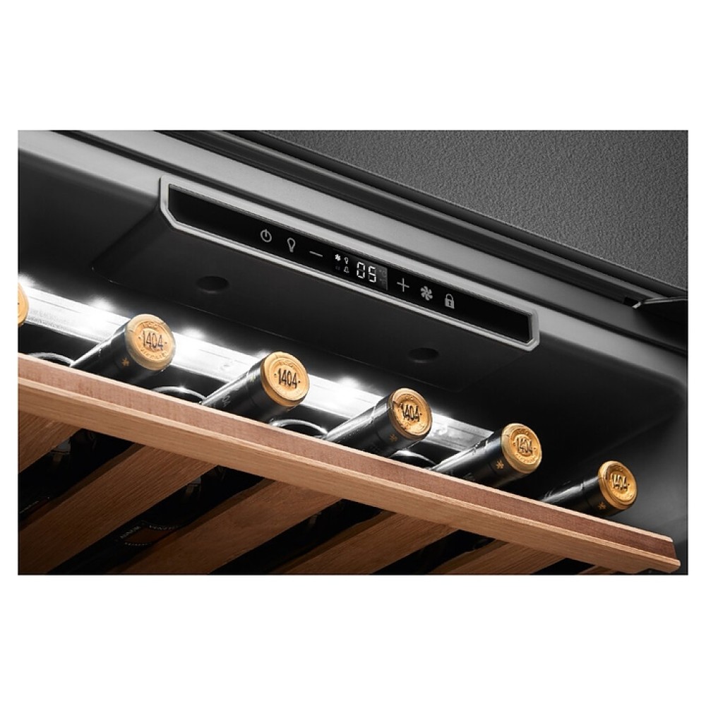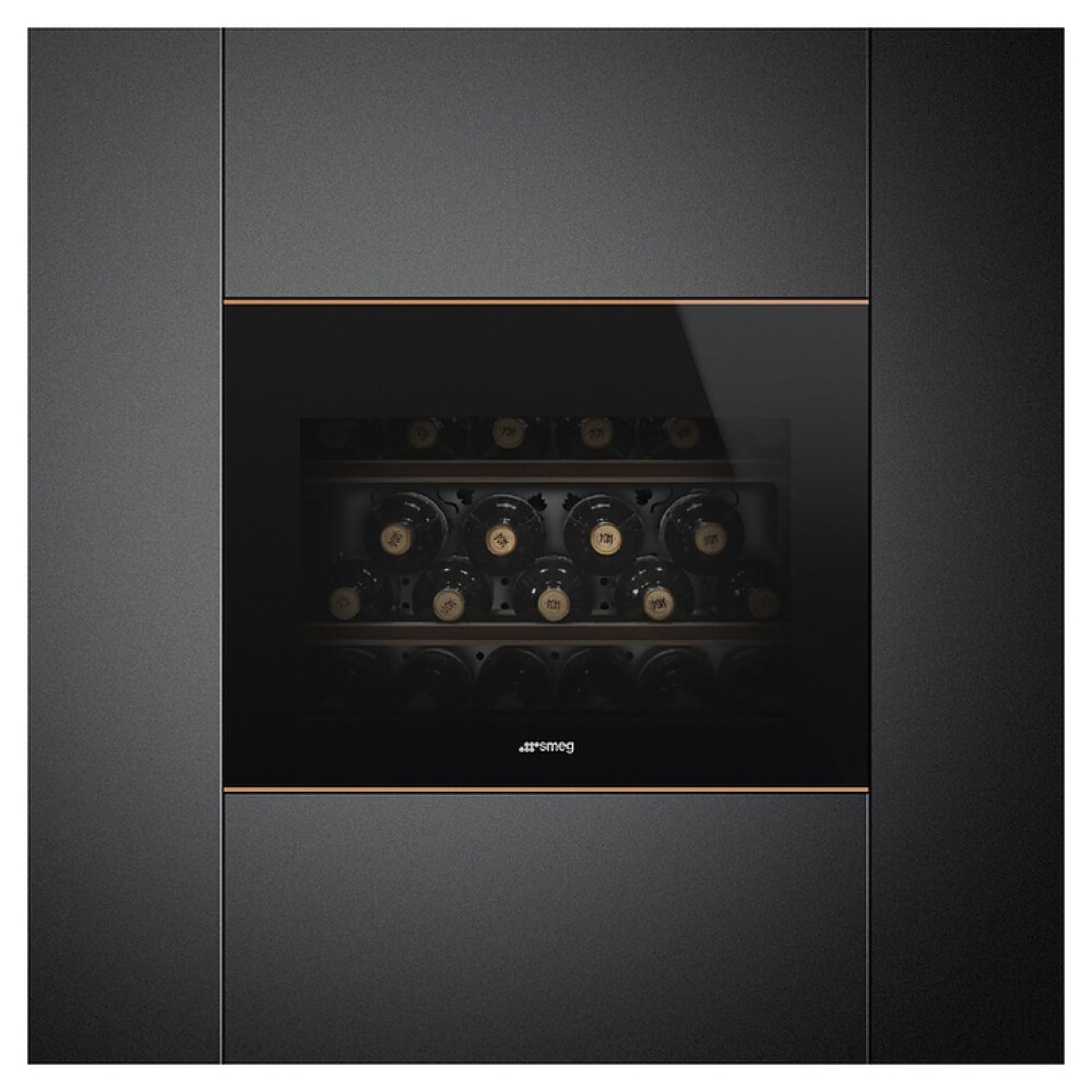 Винный шкаф SMEG CVI621NR3 предназначен для охлаждения, хранения при оптимальных условиях и демонстрации бутилированного вина различных сортов в гостиницах и домашних условиях. Модель оснащена монотемпературной холодильной камерой с интегрированной в основание стационарной и 2 выдвижными полками с направляющими для размещения бутылок, правосторонней распашной дверью на перенавешиваемых петлях с обзорным окном, внутренней сенсорной панелью управления с жидкокристаллическим цифровым дисплеем и белой подсветкой индикации. Корпус выполнен из металла, боковины с антикоррозийным покрытием порошковой краской, фронт c полным внешним остеклением без винтового крепежа стеклом Eclipse c полупрозрачной черной тонировкой и глянцевой поверхностью, горизонтальные фронтальные рамки – из металла с поверхностью медного оттенка, выдвижные полки – из массива древесины светлой породы.