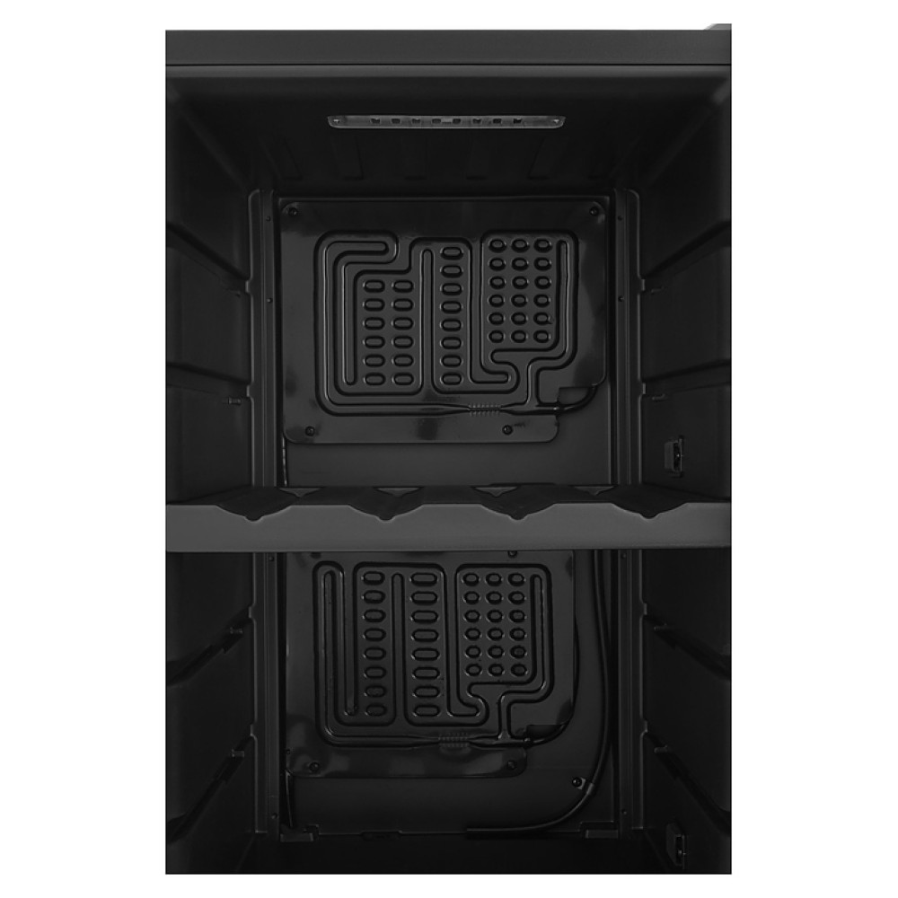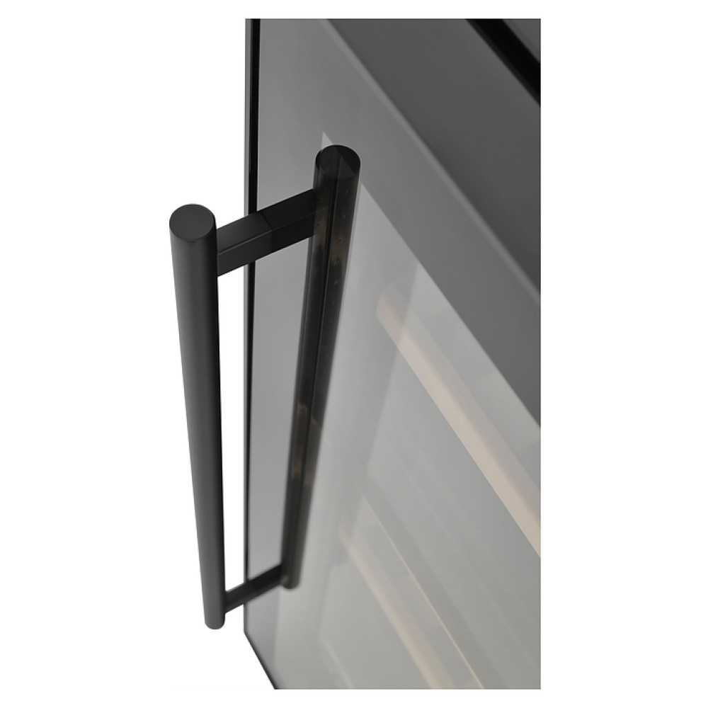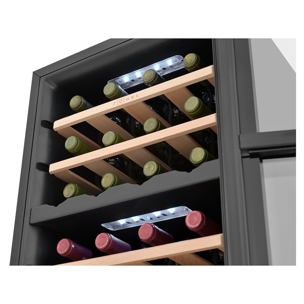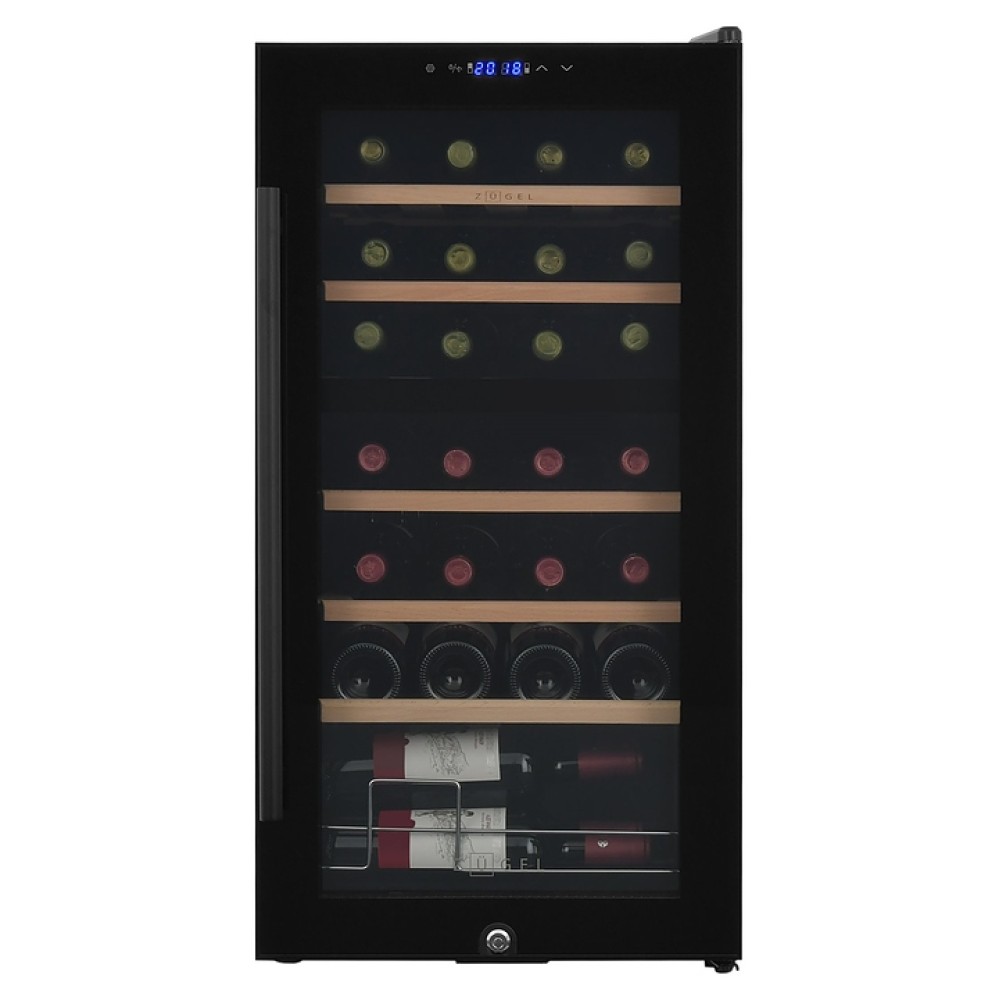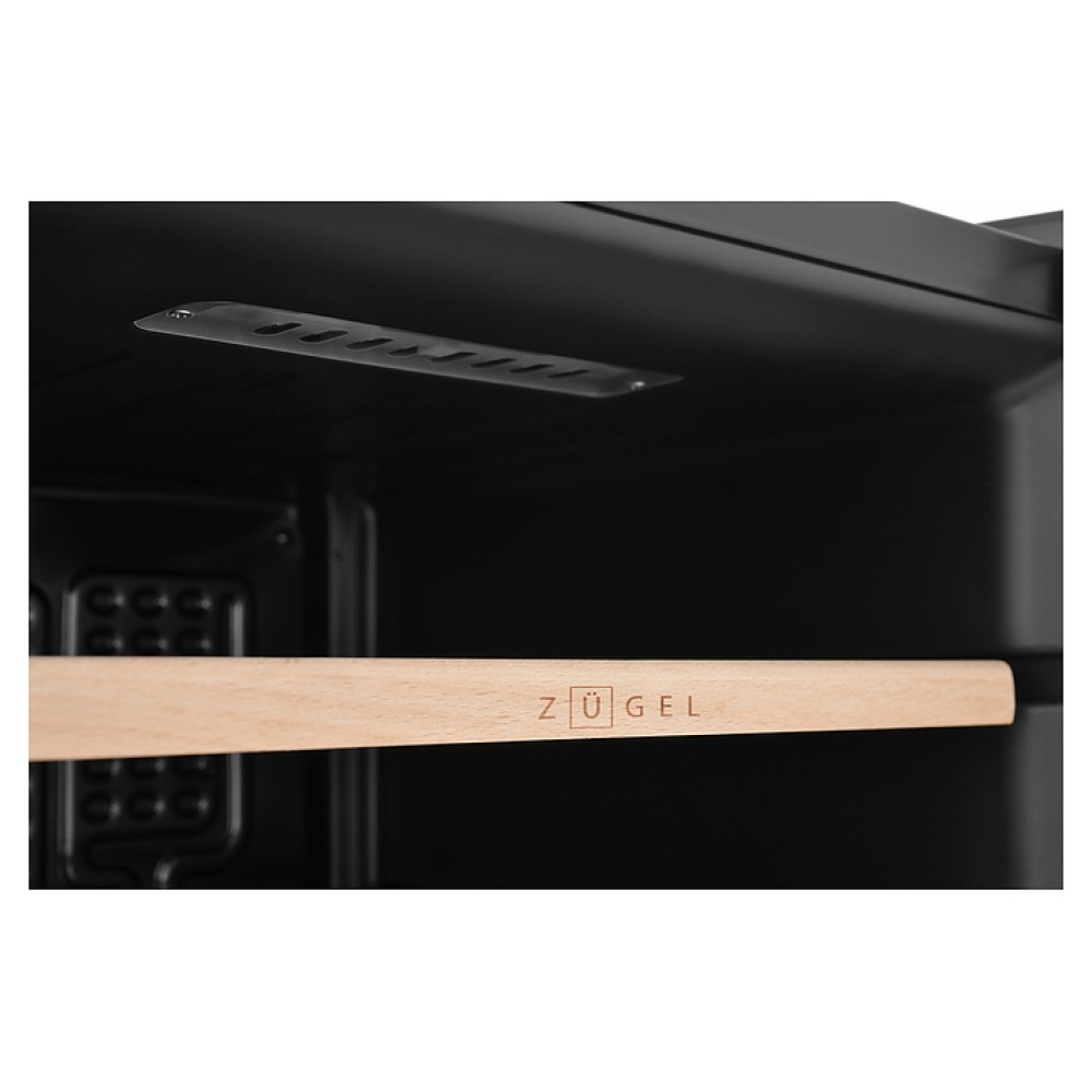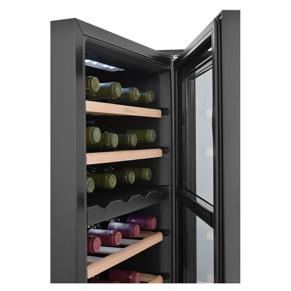 Винный шкаф Zugel ZCWF281DB предназначен для хранения при оптимальных условиях бутилированного вина различных сортов в барах, ресторанах, специализированных магазинах, подсобных складских помещениях, а также домашних условиях. Модель оснащена холодильной камерой c 2 температурными зонамии, интегрированными направляющими для полок, правосторонней распашной дверью с длинной трубчатой вертикальной рукояткой и обзорным остеклением, кабелем питания, расположенной на фасаде двери электронной панелью управления с сенсорными функциональными клавишами и цифровым жидкокристаллическим дисплеем с голубой подсветкой индикации. Корпус и рукоятка выполнены из металла с матовым антикоррозийным покрытием черного цвета, дверь с полным фронтальным остеклением без винтового крепежа, рама двери и внутренняя облицовка камеры черного цвета, остекление – из тонированного закаленного стекла, стандартные полки – из массива буковой древесины с фронтальной гравировкой логатипа, витринная полка – из металла.