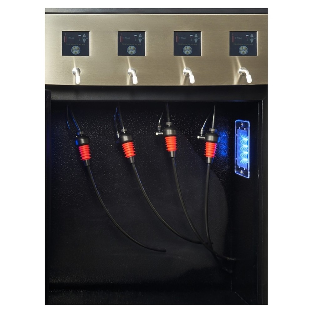 Диспенсер Vinosafe VSWD04AM предназначен для охлаждения и дозированного розлива бутилированного вина 4 различных сортов в барах, ресторанах, на других предприятиях общественного питания, а также домашних условиях. Модель оснащена холодильной камерой, системой подачи напитка с 4 заборными трубками с колпачками и 4 кранами, распашной дверью, прозрачным обзорным остеклением, внешней сенсорной панелью управления с цифровым дисплеем и 4 жидкокристаллическими сенсорными экранами для управления розливом. Корпус и рама двери выполнены из металла с антикоррозийным покрытием черного цвета, фронтальная панель – из металла с серебристой поверхностью.