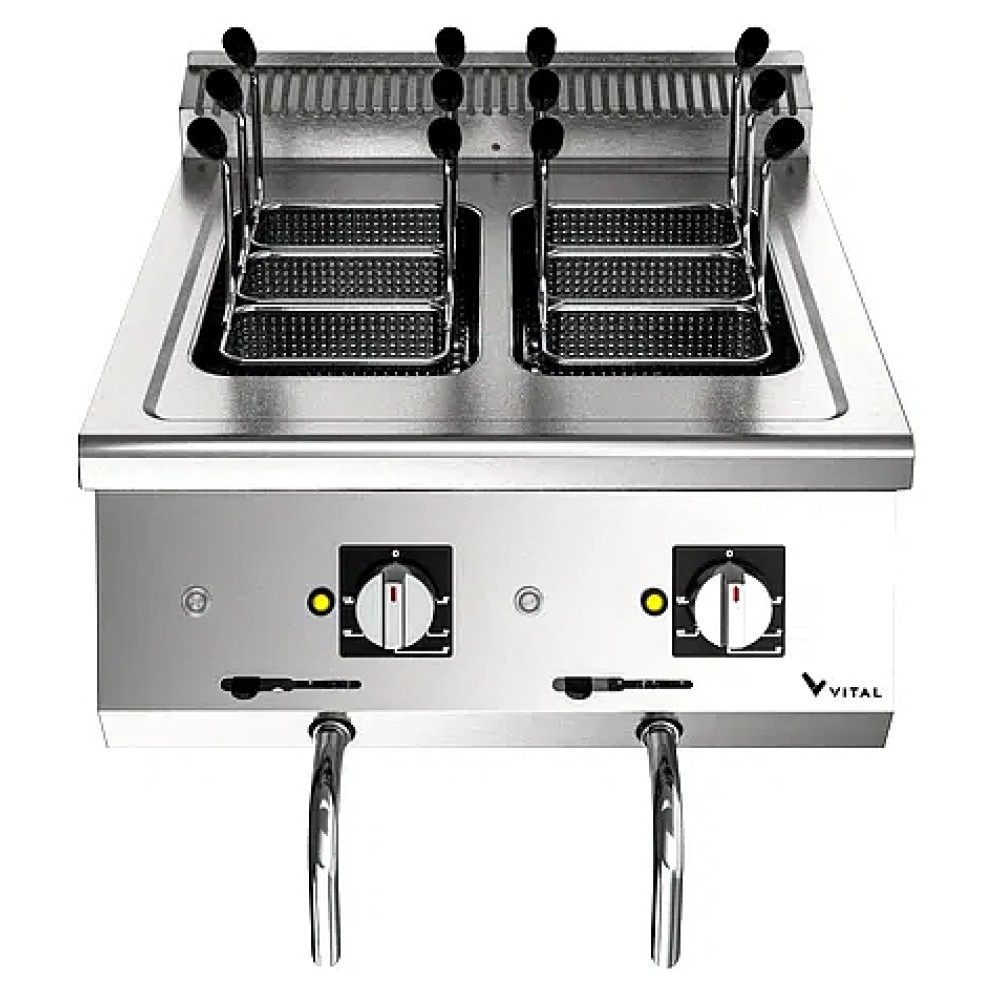 Макароноварка VITAL EMF6020 серии 600 используется на предприятиях общественного питания и торговли для отваривания всех видов макаронных изделий, гарниров из круп, пельменей и вареников. Модель оснащена предохранительным термостатом E.G.O., водозаборным краном, клапаном слива и трубой перелива. Закругленные углы рабочей поверхности обеспечивают легкую чистку. Корпус выполнен из нержавеющей стали.