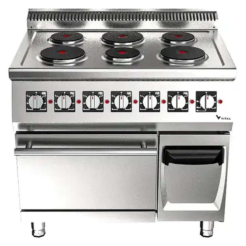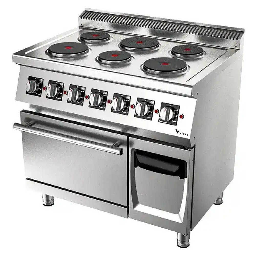Электрическая плита VITAL EKF6030 серии 600 предназначена для приготовления различных блюд из мяса, птицы, рыбы и овощей в наплитной посуде на предприятиях общественного питания и торговли. Модель оснащена 6 круглыми конфорками, духовым шкафом, прессованной монолитной столешницей и 6-ступенчатыми тепловыми переключателями. Закругленные края плиты обеспечивают легкую чистку. Корпус выполнен из нержавеющей стали.
