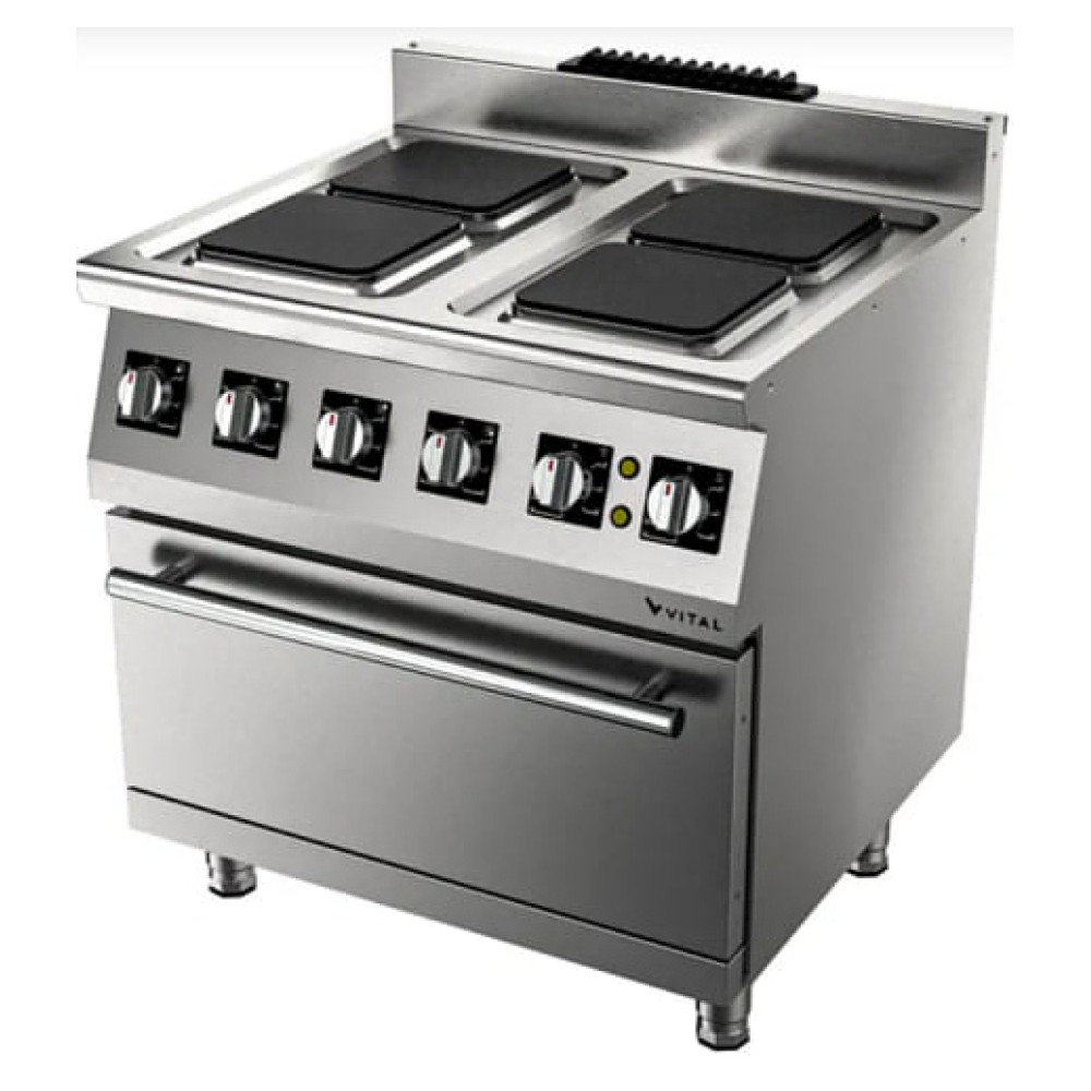 Электрическая плита VITAL PRO-EKF7020K серии 700 предназначена для приготовления различных блюд из мяса, птицы, рыбы и овощей в наплитной посуде на предприятиях общественного питания и торговли. Модель оснащена 4 квадратными конфорками с независимым управлением, прессованной монолитной столешницей и духовкой. Закругленные края столешницы обеспечивают легкую чистку. Корпус выполнен из нержавеющей стали.