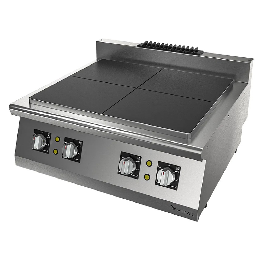 Электрическая плита VITAL PRO-EST7020 серии 700 предназначена для приготовления различных блюд из мяса, птицы, рыбы и овощей в наплитной посуде на предприятиях общественного питания и торговли. Модель оснащена 4 конфорками с независимым управлением и прессованной монолитной столешницей. Закругленные края столешницы обеспечивают легкую чистку. Корпус выполнен из нержавеющей стали, конфорки - из сплава Incoloy 800, который отличается прочностью, долговечностью, устойчивостью к высоким температурам, известковой коррозии и воздействию химикатов.