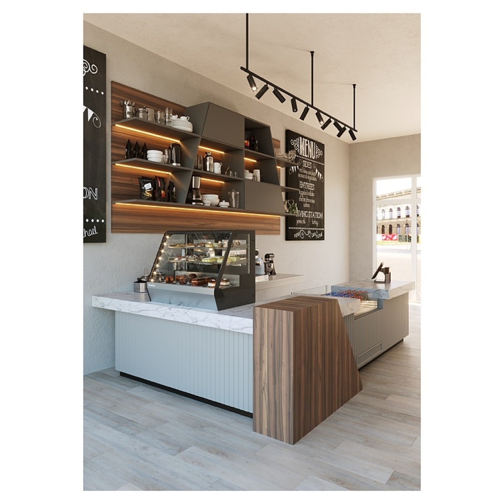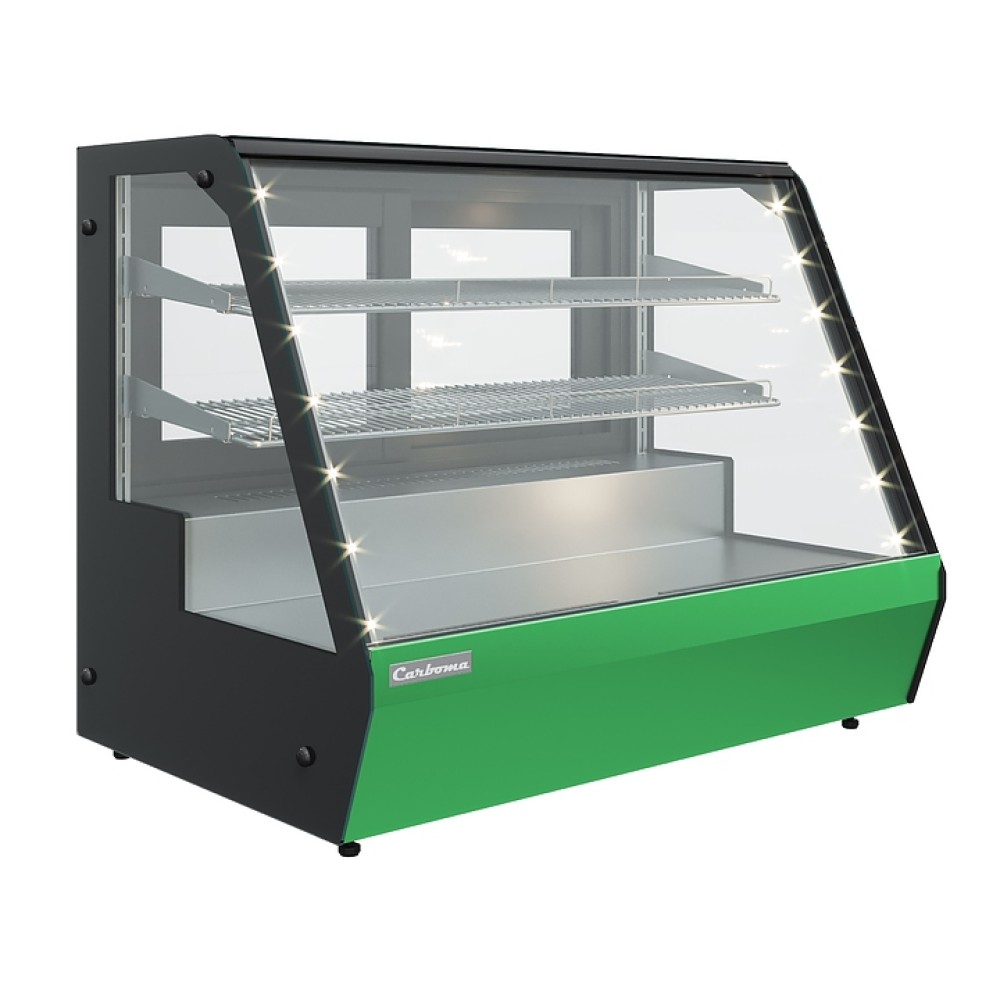 Кондитерская витрина Carboma A59 VV 0,9-1 используется на предприятиях общественного питания и торговли для демонстрации, охлаждения и кратковременного хранения тортов, пирожных и других кондитерских изделий. Модель оснащена закаленными стеклопакетами, гнутым фронтальным стеклом, 2 регулируемыми полками-решетками, встроенной ручкой и регулируемыми ножками. Корпус выполнен из стали, термоизоляция - из пенополиуретана, экспозиционная поверхность - из нержавеющей стали.