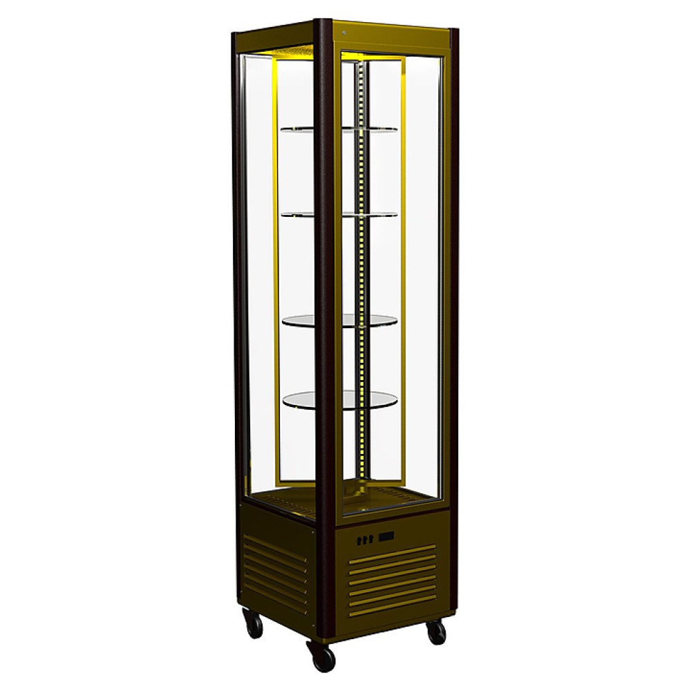 Кондитерская витрина Carboma R400Cвр Люкс используется на предприятиях общественного питания и торговли для демонстрации, охлаждения и кратковременного хранения тортов, пирожных и других кондитерских изделий. Модель оснащена 4-х сторонним остеклением, 4 крутящимися полками, которые можно устанавливать на разные уровни, замком и регулируемыми колесами высотой 100 мм.