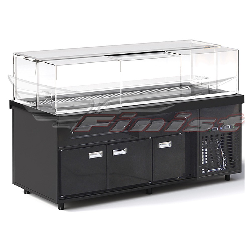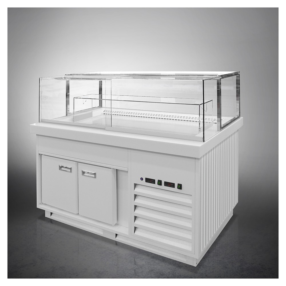 Напольная кондитерская витрина Finist Maria Msv-16-9 предназначена для кратковременного хранения и предпродажной демонстрации десертов и кондитерских изделий на предприятиях общественного питания и торговли. Модель оснащена охлаждаемой камерой-накопителем, выдвижной полкой, столешницей и подсветкой. Фасады выполнены из МДФ, купол - из просветленного стекла, двери-купе - из оргстекла, , зона выкладки и столешница - из искусственного камня, который отличается прочностью, долговечностью, гигиеничностью, легко очищается и не впитывает запахи.