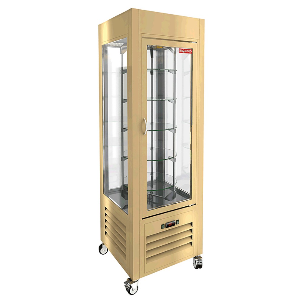 Кондитерская витрина HICOLD VRC 350 R Beige используется на предприятиях общественного питания и торговли для демонстрации, охлаждения и кратковременного хранения кондитерских изделий и десертов. Модель оснащена 5 вращающимися полками и колесами со стопором. Корпус выполнен из окрашенной стали и однокамерного стеклопакета.