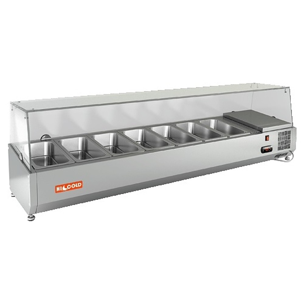 Настольная холодильная витрина HICOLD VRX 1600 используется на предприятиях общественного питания и торговли для демонстрации, охлаждения и кратковременного хранения салатов, гарниров, закусок и других готовых блюд. Модель оснащена стеклянной надстройкой и ножками. Изделие выполнено из нержавеющей стали.