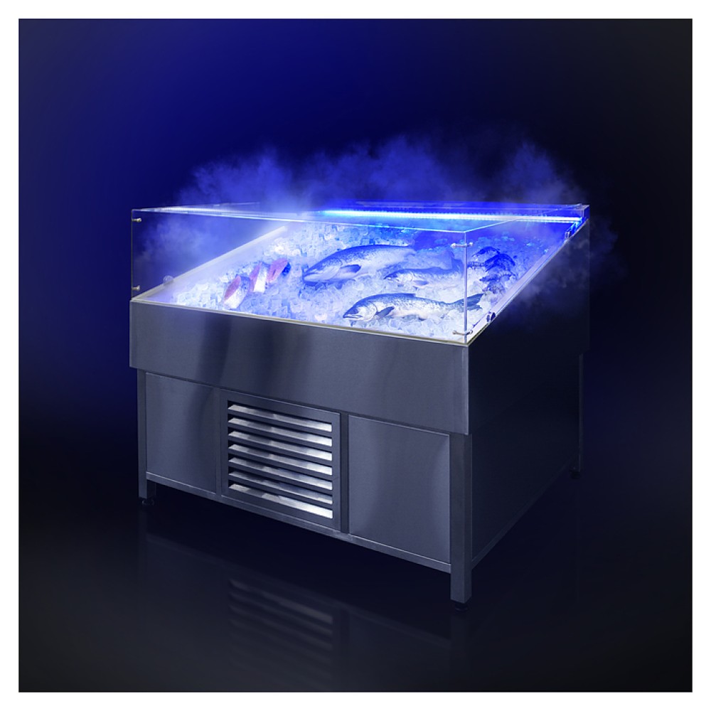 Витрина Finist VFgt/1250 используется на предприятиях общественного питания и торговли для охлаждения и эффектной предпродажной демонстрации рыбы и морепродуктов на льду. Система увлажнения воздуха создает туман, который выполняет функции увлажнения продуктов и привлечения внимания покупателей. Двойные стенки позволяют дольше сохранять температуру в емкости и замедляют процесс таяния льда, вмонтированный кран для слива воды позволяет подсоединить ванну напрямую к системе водоотведения. Цельнозаливной корпус выполнен из нержавеющей стали.