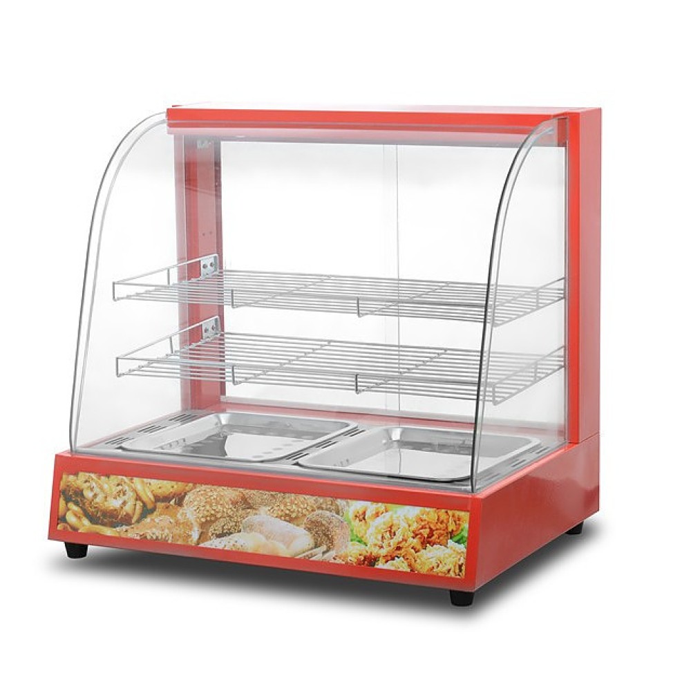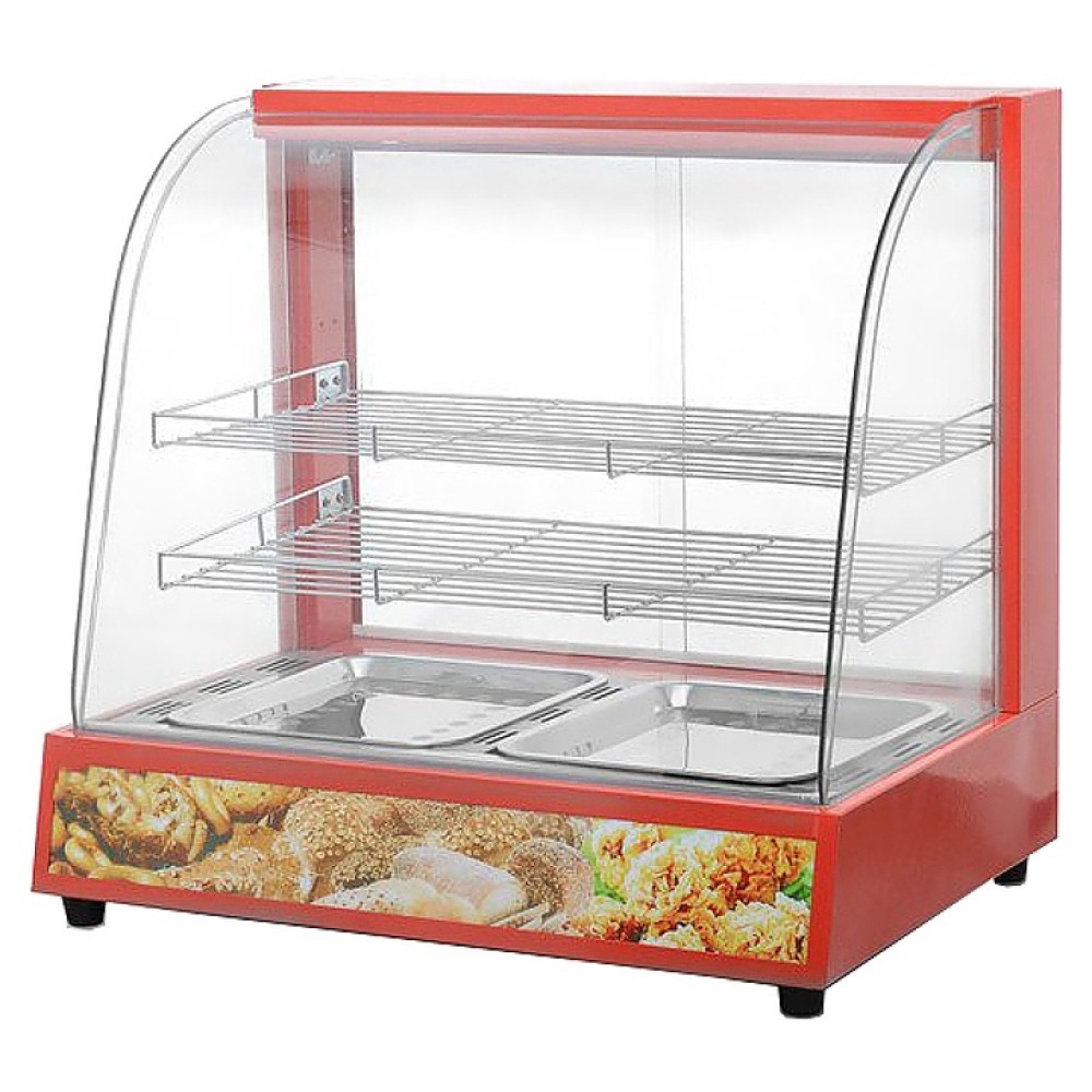Тепловая витрина Rosso HW-2P предназначена для демонстрации и поддержания блюд в горячем состоянии на предприятиях общественного питания и торговли. Модель оснащена термостатом, декоративной лампой освещения для лучшего вида пищевых продуктов, поворотным переключателем для выбора температуры, 2 полками из нержавеющей стали и 2 емкостями.