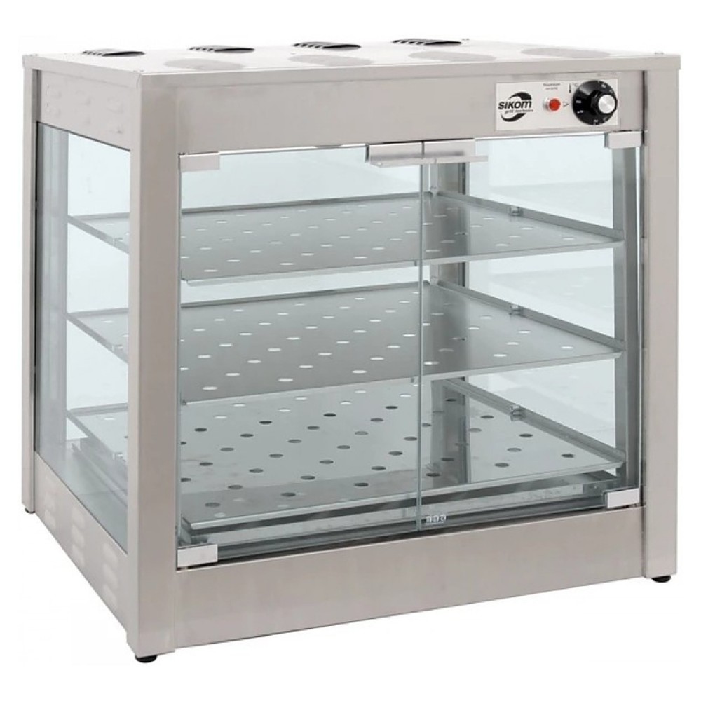 Тепловая витрина Sikom ВН-4.3 (МК-4.3) используется на предприятиях общественного питания и торговли, а также в производственных цехах, деятельность которых связана с выпуском гастрономических товаров, для демонстрации, подогрева и кратковременного хранения различных блюд и продуктов. Модель осащена 3 перфорированными полками, поддоном для сбора жира, термостатом, подсветкой и 2 распашными дверцами. Корпус выполнен из нержавеющей стали, боковые панели и дверцы - из жаропрочного стекла.