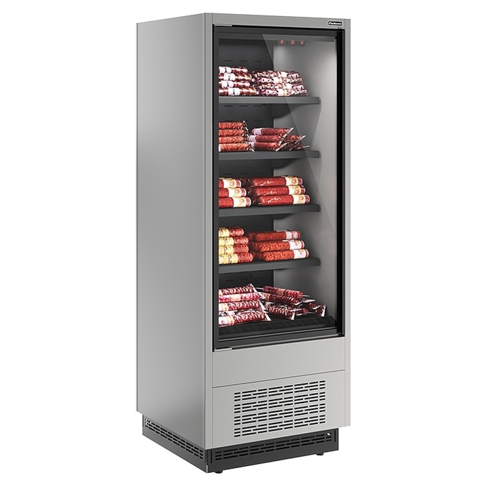 Холодильная горка Carboma FC 20-07 VV 0,6-1 версия 2.0 Standard серии Cube 2 используется на предприятиях общественного питания и торговли для охлаждения, кратковременного хранения и предпродажной демонстрации напитков, мяса, птицы, полуфабрикатов, молочных и гастрономических изделий. Модель оснащена 4 рядами навесных полок с кронштейнами, распашной дверью с рукояткой по всей длине створки, глухими боковинами, подставкой с фронтальной термовыводящей и цокольной решетками. Корпус прямоугольно ориентированной формы выполнен из стали с антикоррозийным покрытием внешних панелей, полок и кронштейнов серого цвета (RAL 9006), цоколя и интерьера черного цвета (RAL 9005), теплоизоляция – из пенополиуретана.