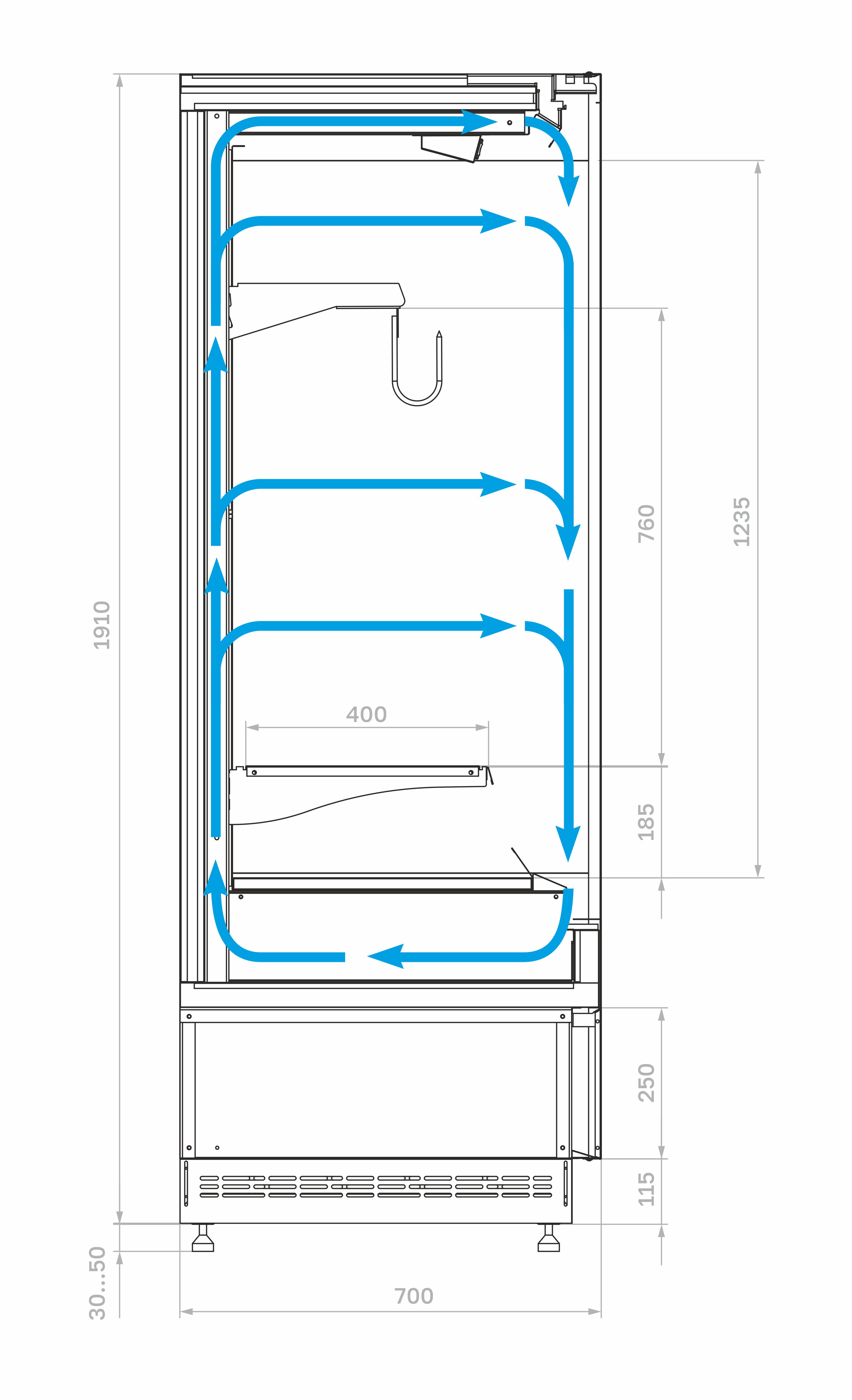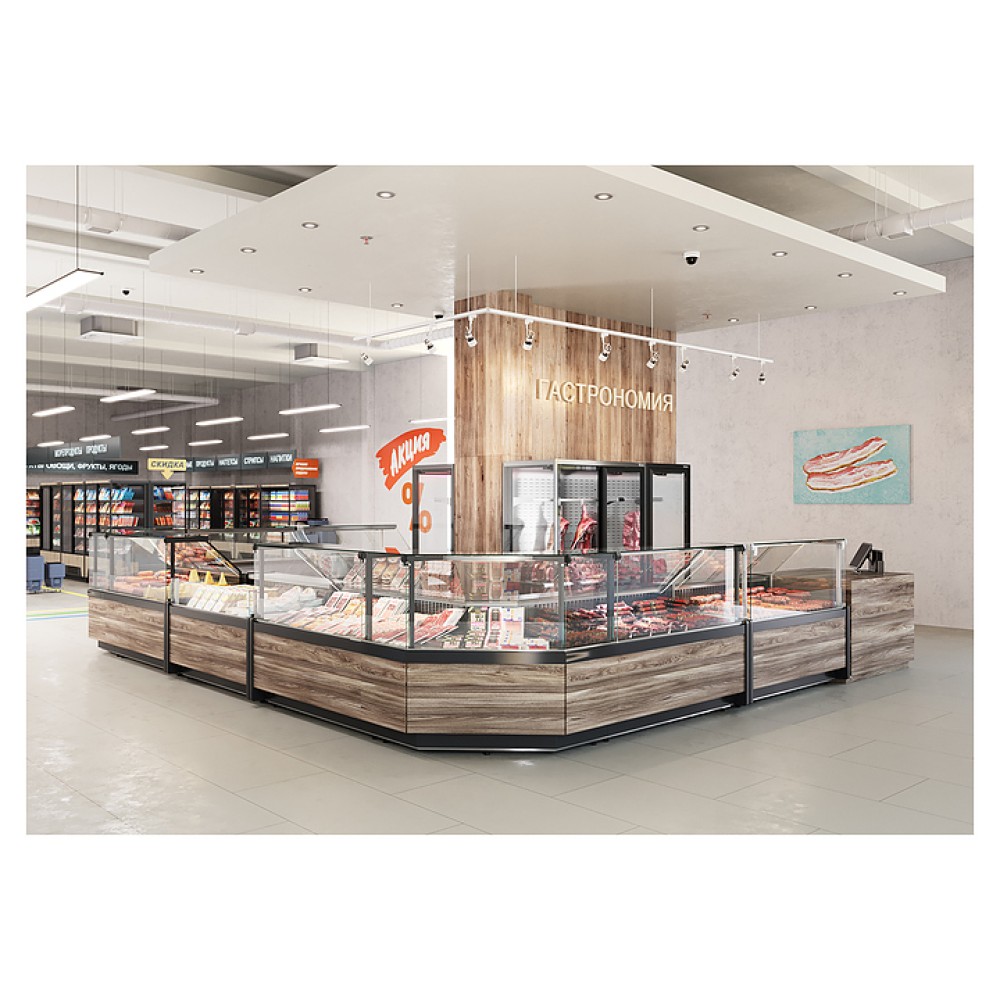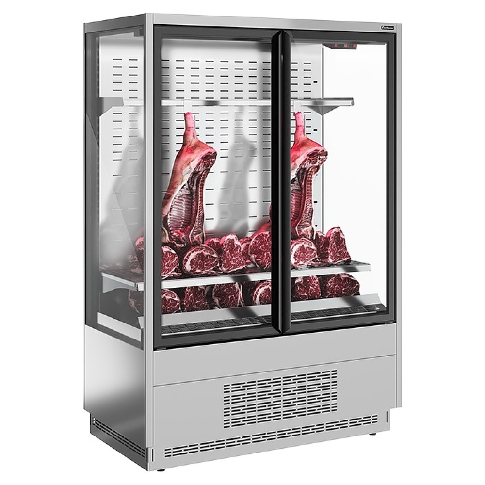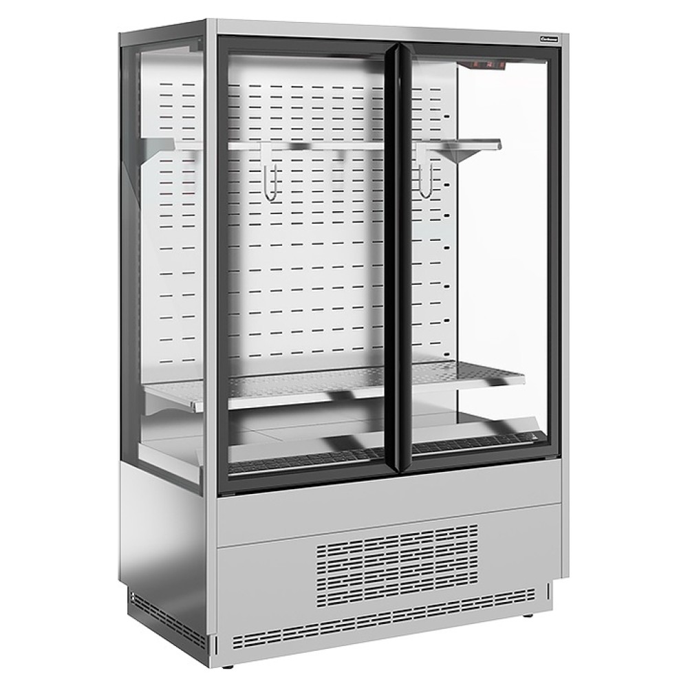 Среднетемпературная холодильная горка Carboma FC 20-07 VV 1,0-1 версия 2.0 Standard серии Сube Flesh 2 используется на предприятиях общественного питания и торговли для кратковременного хранения и предпродажной демонстрации мясной продукции. Модель оснащена навесной перфорированной полкой с кронштейнами, подвесом с крюками для мяса, 2 распашными дверьми с рукоятками по всей длине створок, подставкой с фронтальной термовыводящей и цокольной решетками. Корпус прямоугольно ориентированной формы выполнен из стали с антикоррозийным покрытием внешних панелей и интерьера цвета нержавеющая сталь (RAL 0430), теплоизоляция – из пенополиуретана.