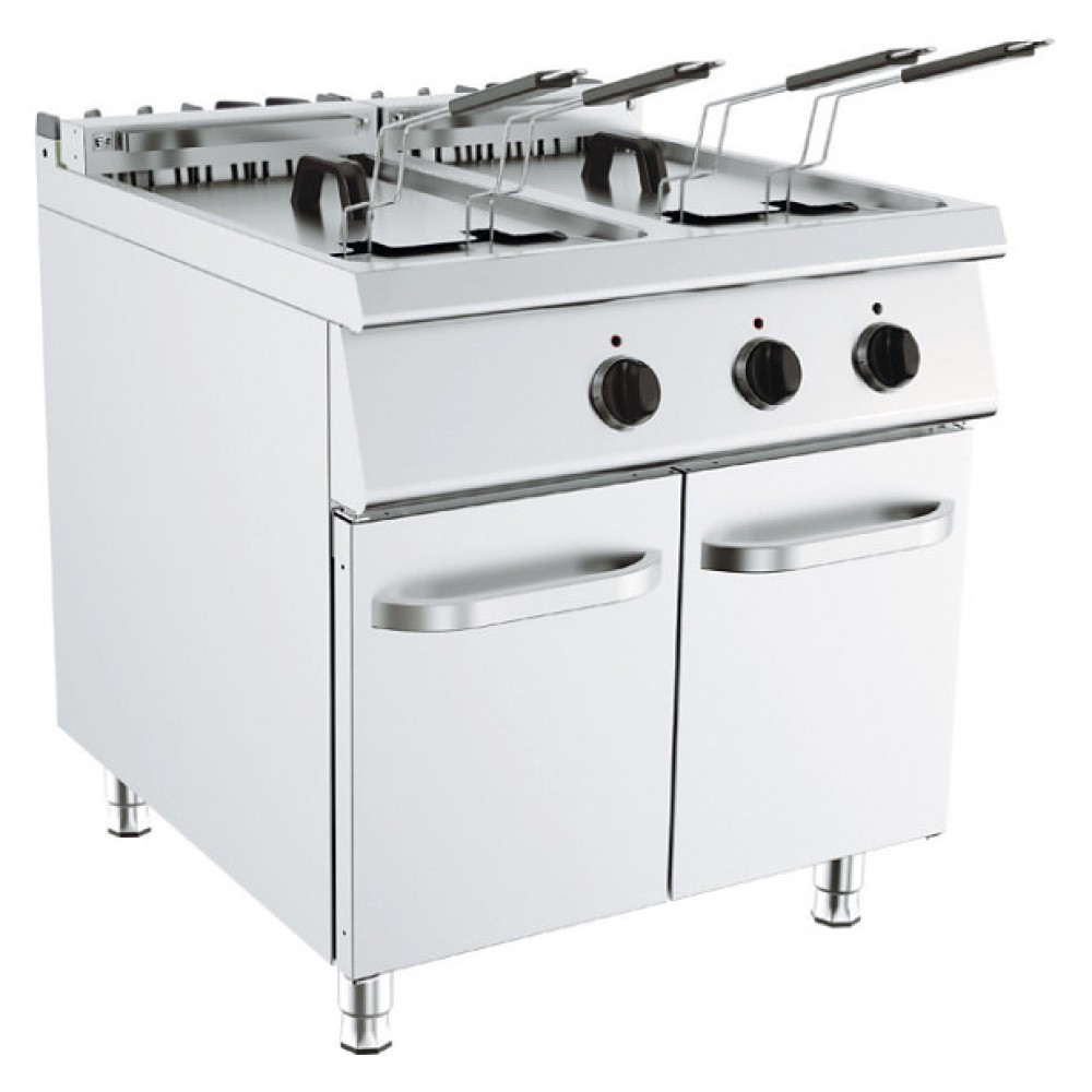 Напольная электрическая фритюрница Вулкан Лайт VF98922E используется на предприятиях общественного питания и торговли отдельно или в составе тепловой линии Лайт 900 для приготовления различных блюд в большом количестве горячего масла или жира. Модель оснащена индикаторами контроля температуры работы и нагрева, защитным термостатом, стендом с 3 сторон, 2 распашными дверьми и регулируемыми ножками. Корпус и корзины выполнены из нержавеющей стали, задняя решетка - из чугуна с эмалированным покрытием.