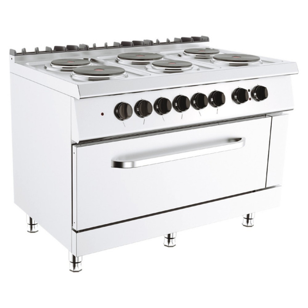 Электрическая плита Вулкан Лайт VP712962E-OV используется на предприятиях общественного питания и торговли отдельно или в составе тепловой линии Лайт 700 для приготовления широкого спектра блюд в наплитной посуде. Модель оснащена 6 варочными конфорками со ступенчатым контролем температуры, духовым шкафом, стендом с 3 сторон и регулируемыми ножками. Корпус выполнен из нержавеющей стали, задняя решетка - из чугуна с эмалированным покрытием.