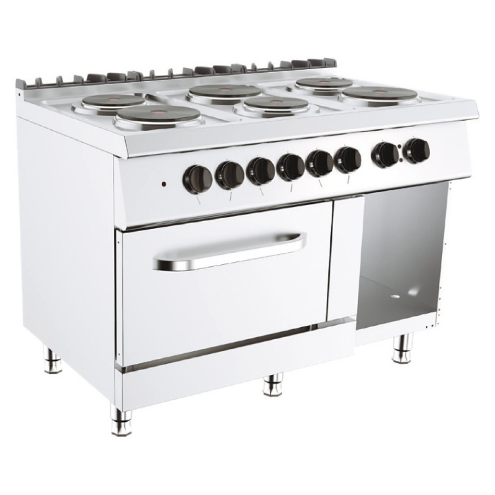 Электрическая плита Вулкан Лайт VP712962E-WOV используется на предприятиях общественного питания и торговли отдельно или в составе тепловой линии Лайт 700 для приготовления широкого спектра блюд в наплитной посуде. Модель оснащена 6 варочными конфорками со ступенчатым контролем температуры, духовым шкафом, стендом с 3 сторон и регулируемыми ножками. Корпус выполнен из нержавеющей стали, задняя решетка - из чугуна с эмалированным покрытием.