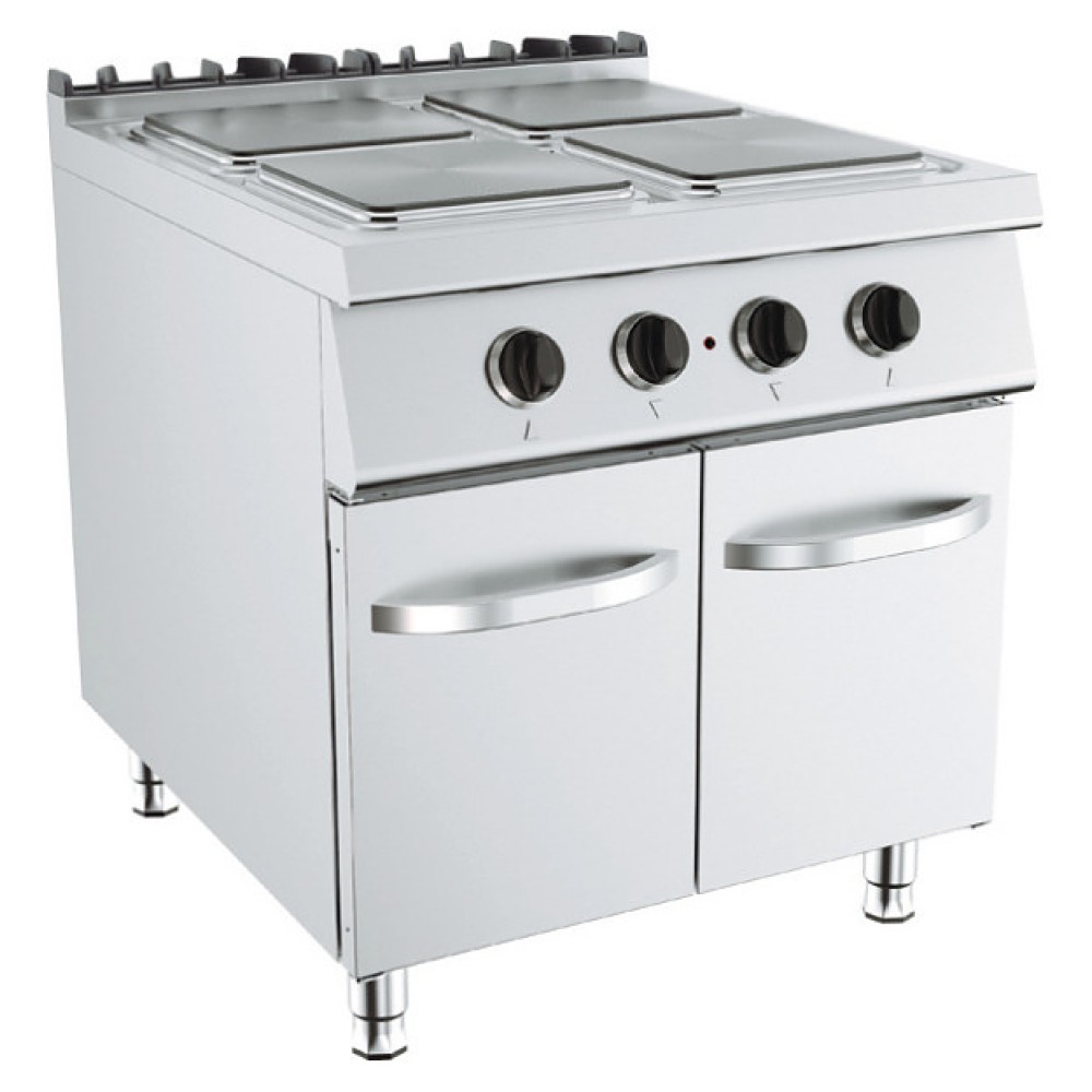 Электрическая плита Вулкан Лайт VP98922E-2D используется на предприятиях общественного питания и торговли отдельно или в составе тепловой линии Лайт 900 для приготовления широкого спектра блюд в наплитной посуде. Модель оснащена 4 варочными конфорками квадратной формы со ступенчатым контролем температуры, стендом с 3 сторон, 2 распашными дверьми и регулируемыми ножками. Корпус выполнен из нержавеющей стали, задняя решетка - из чугуна с эмалированным покрытием.