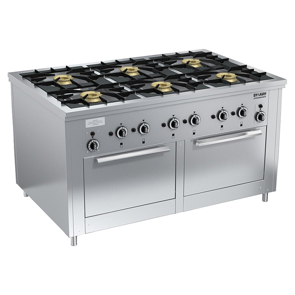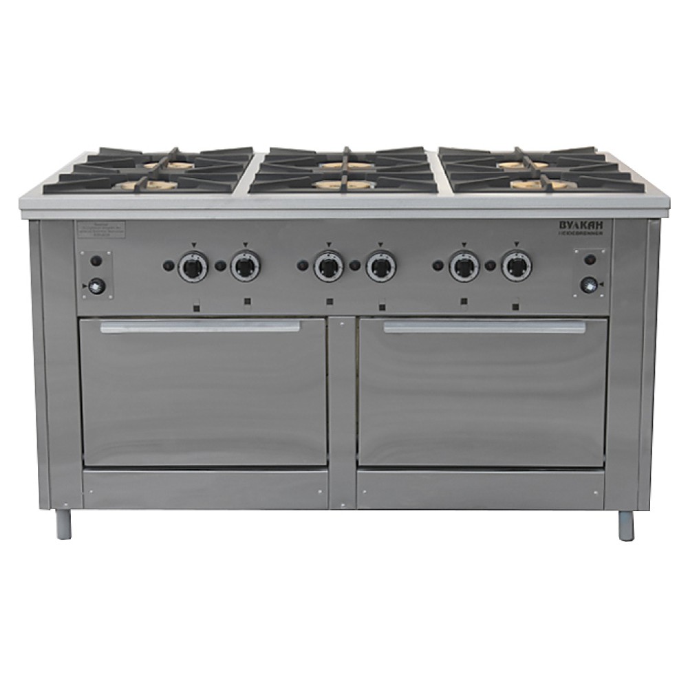 Газовая плита Вулкан ПРГ-IIA-6 2ДШ Maxi предназначена для приготовления первых, вторых и третьих блюд в наплитной посуде, выпечки хлебобулочных и кондитерских изделий на предприятиях общественного питания и торговли. Модель оснащена 2 духовыми шкафами, газ-контролем, пьезорозжигом и запальной горелкой. Корпус выполнен из нержавеющей стали, решетка - из чугуна.