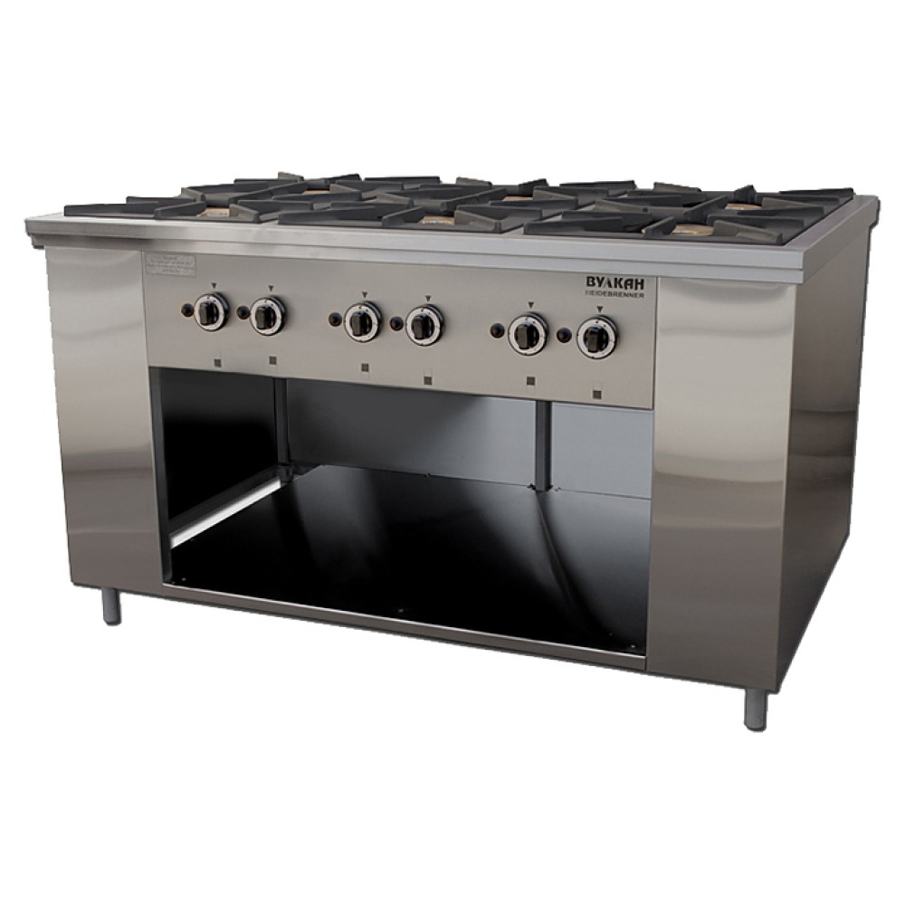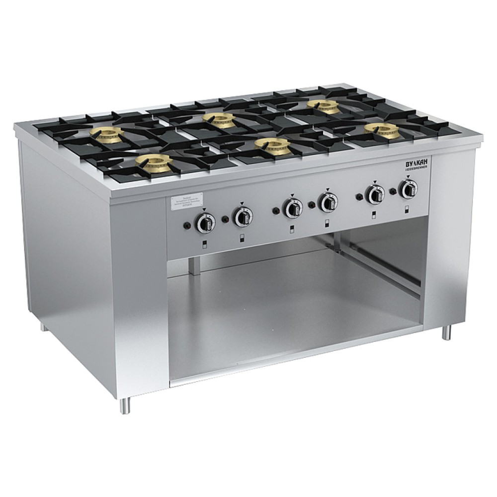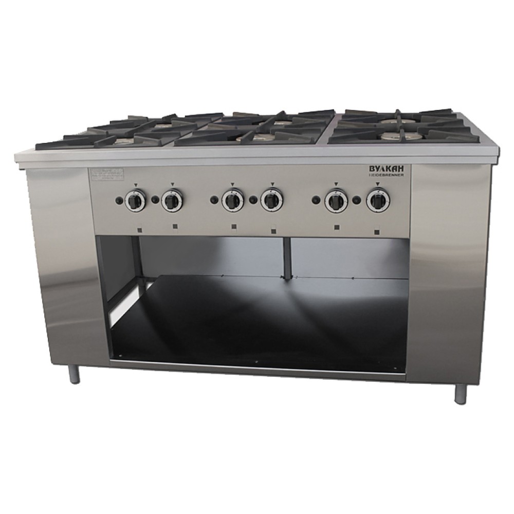 Газовая плита Вулкан ПРГ-IIA-6 Maxi предназначена для приготовления первых, вторых и третьих блюд в наплитной посуде на предприятиях общественного питания и торговли. Модель оснащена газ-контролем, пьезорозжигом и запальной горелкой. Корпус выполнен из нержавеющей стали, решетки - из чугуна, газовые горелки - из латуни.