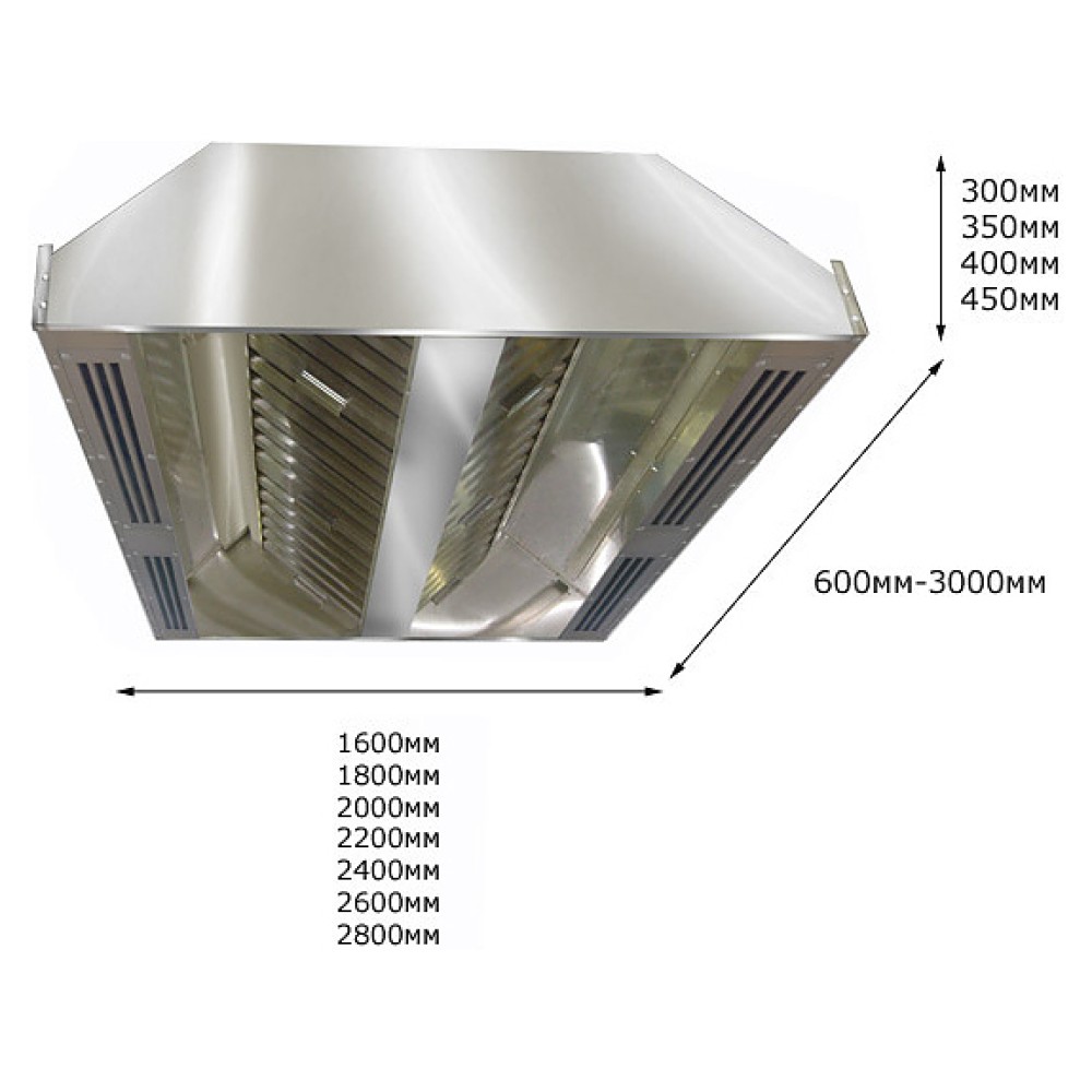 Центральный приточно-вытяжной зонт ITERMA ЗЦПВ-2000Х1400Х350 предназначен для очистки воздуха от паров жира, масла и воды на предприятиях общественного питания и торговли. Модель подключается к существующей системе вытяжной вентиляции и оснащена съемным лабиринтовым фильтром. Возможна установка подсветки.