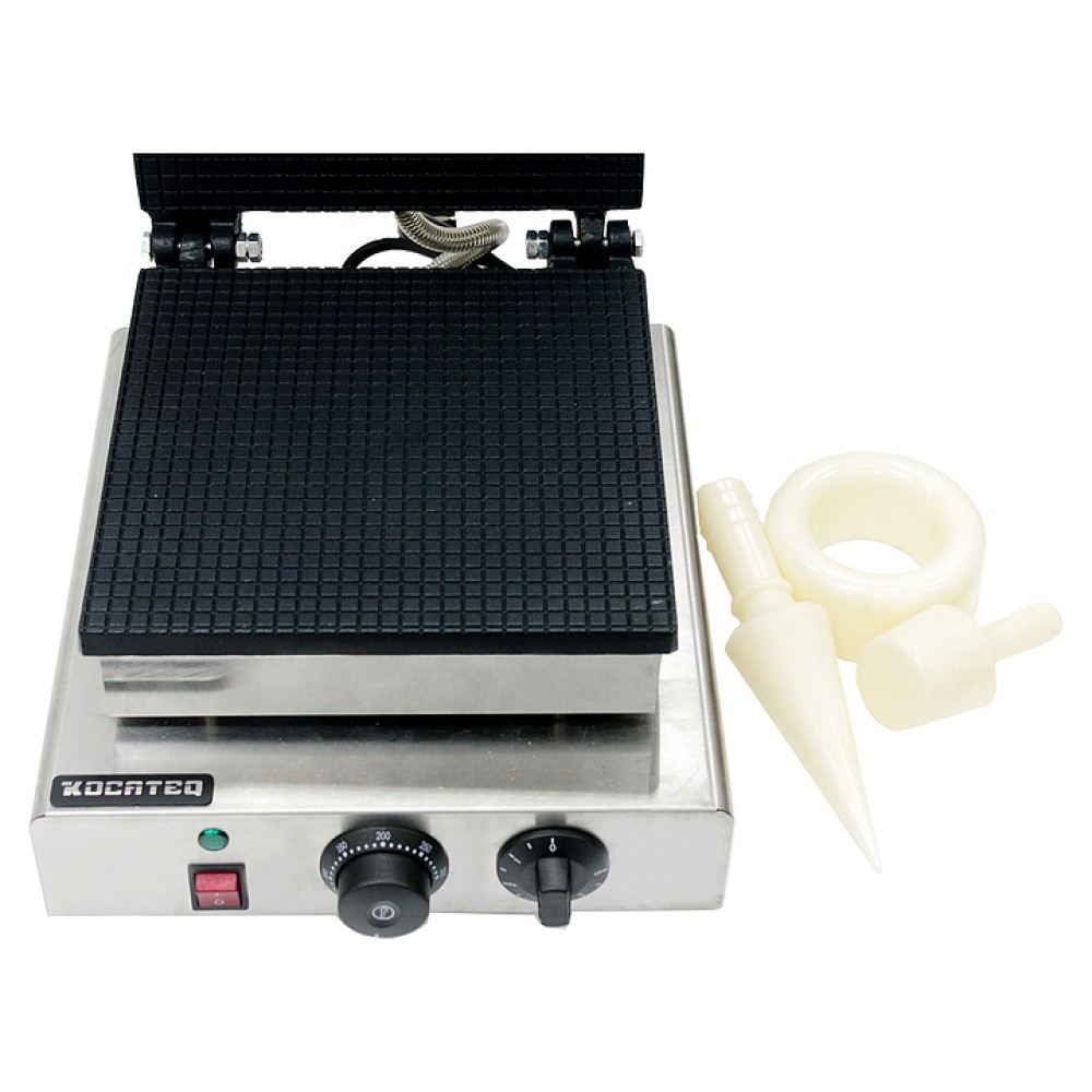 Вафельница Kocateq GH15SBNW используется на предприятиях общественного питания и торговли, в пекарнях и кондитерских для выпечки тонких вафель для рожков. Модель оснащена механической панелью управления, таймером и термостатом для регулировки температуры. Рабочая поверхность выполнена из алюминия с антипригарным покрытием, корпус - из нержавеющей стали, ножки - из пластика.