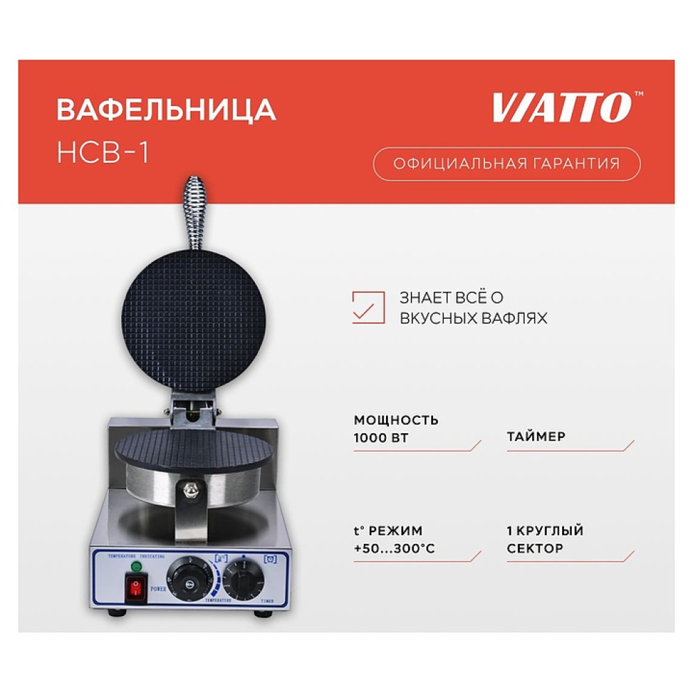 Вафельница VIATTO HCB-1 используется на предприятиях общественного питания и торговли для приготовления тонких вафель для рожка. Модель оснащена терморегулятором и таймером. Рабочие поверхности имеют антипригарное покрытие.