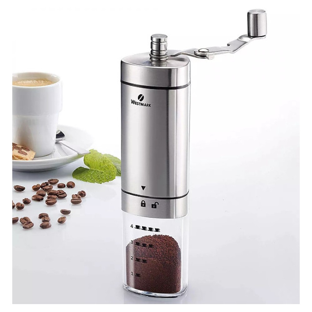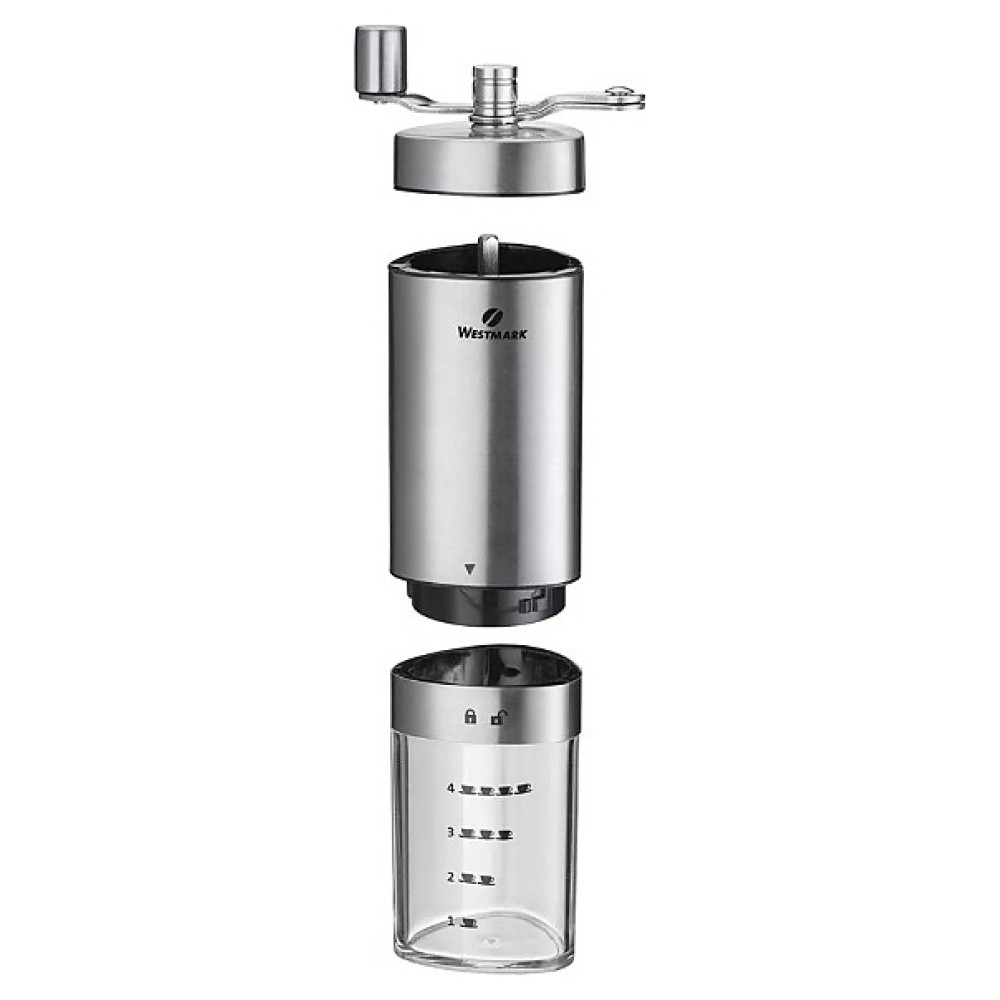 Механическая кофемолка Westmark Brasilia 24902260 серии Coffee&Tea предназначена для приготовления молотого кофе из зерен в домашних условиях. Модель оснащена складной рукояткой, прозрачным резервуаром с мерной шкалой количества порций молотого продукта и отметкой верного положения фиксации на корпусе. Корпус треугольного сечения и рукоятка выполнены из нержавеющей стали, резервуар – из акрила, жернова – из керамики.