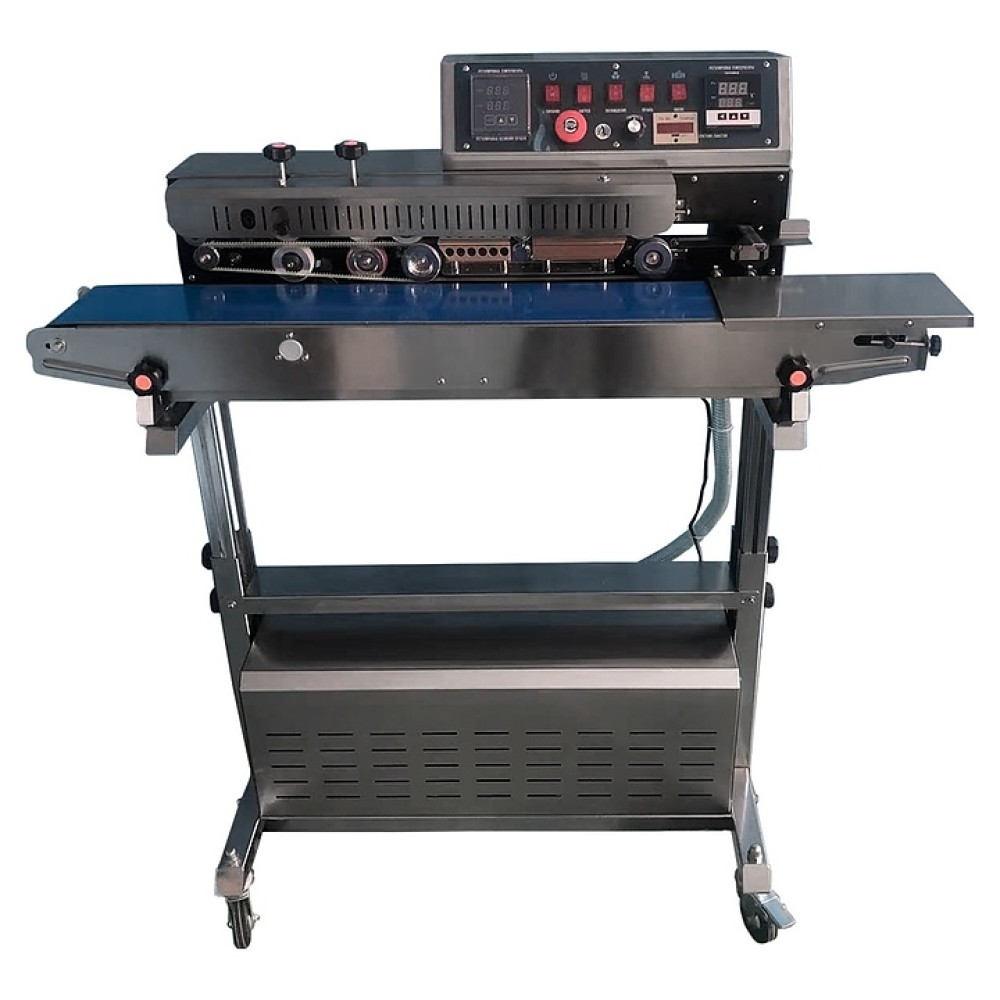 Напольный горизонтальный запайщик пакетов White Penguin WP-1000Q используется на производственных площадках, предприятиях пищевой промышленности, общественного питания и торговли для герметичной упаковки продуктов питания, напитков, медицинских препаратов, металлоизделий, косметики и другой продукции. Модель оснащена вакуумным насосом, запаечными блоками с электронагревателями, горизонтальными конвейерной лентой и запаивающим слотом, загрузочной столешницей и расположенной сверху наклонной электромеханической панелью управления. Корпус выполнен из стали с антикоррозийным покрытием.