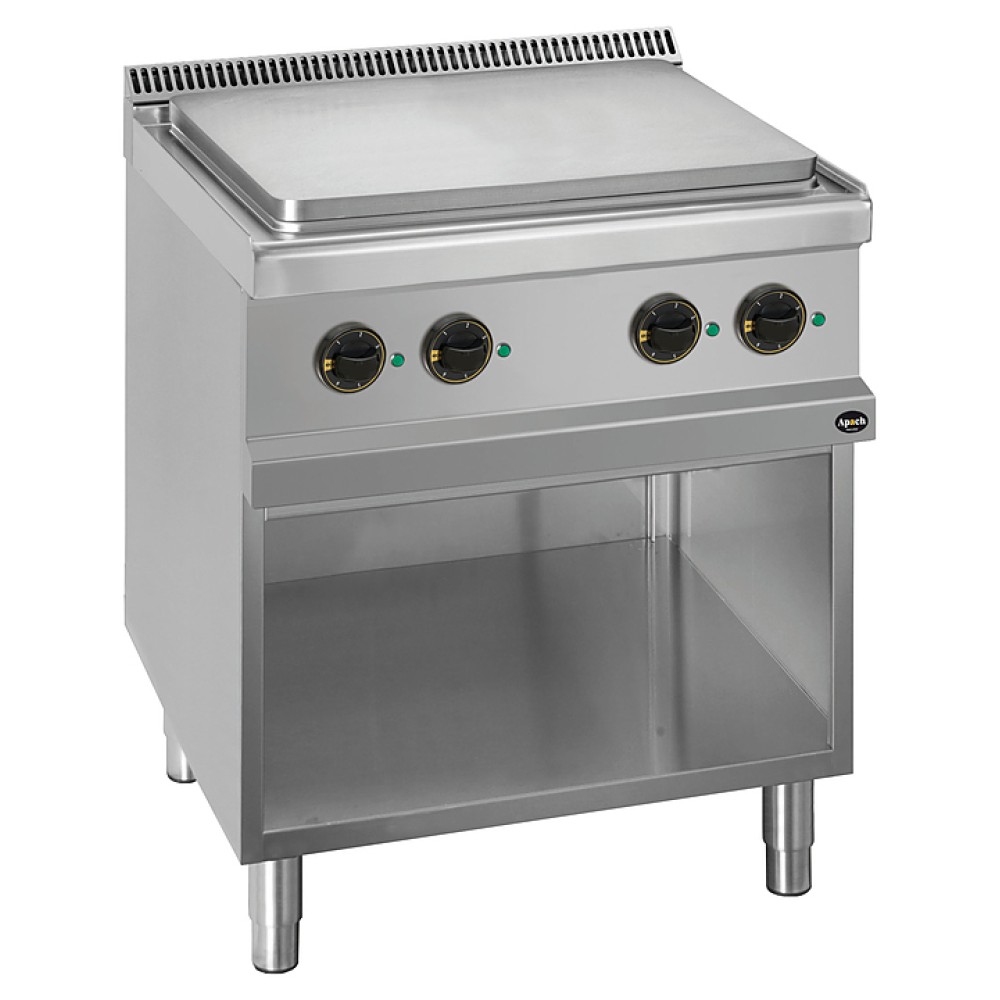 Электрическая плита Apach APRES-77P/PL 700-й серии предназначена для приготовления различных блюд из мяса, птицы, рыбы и овощей в наплитной посуде на предприятиях общественного питания и торговли. Модель оснащена электромеханической панелью управления и открытой подставкой с регулируемыми по высоте ножками. Температура рабочей поверхности в центре достигает 450 °C и уменьшается к краям до 200 °C. Корпус, рабочая поверхность, панель управления и вытяжная решетка выполнены из нержавеющей стали AISI 304, боковые и задняя панели - из нержавеющей стали AISI 430, жарочная поверхность - из легированной стали.