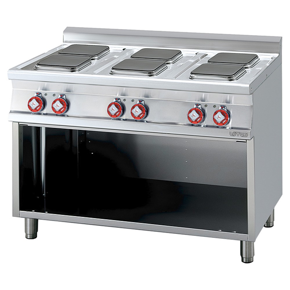 Плита электрическая Lotus PCQ-712ET предназначена для приготовления различных блюд в наплитной посуде на предприятиях общественного питания и торговли. Модель оснащена 7-позиционным переключателем с регулировкой температуры, световыми индикаторами, сигнализирующими о включении конфорок, и регулируемыми ножками. В нейтральном шкафу можно хранить посуду, кухонный инвентарь и продукты, не требующие специального температурного режима.