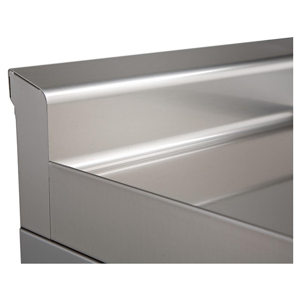 Корпус выполнен из нержавеющей стали 18/10 AISI 304 с зеркальной полировкой, цельной столешницей толщиной 1,2 мм, скругленными углами и хромированными деталями.