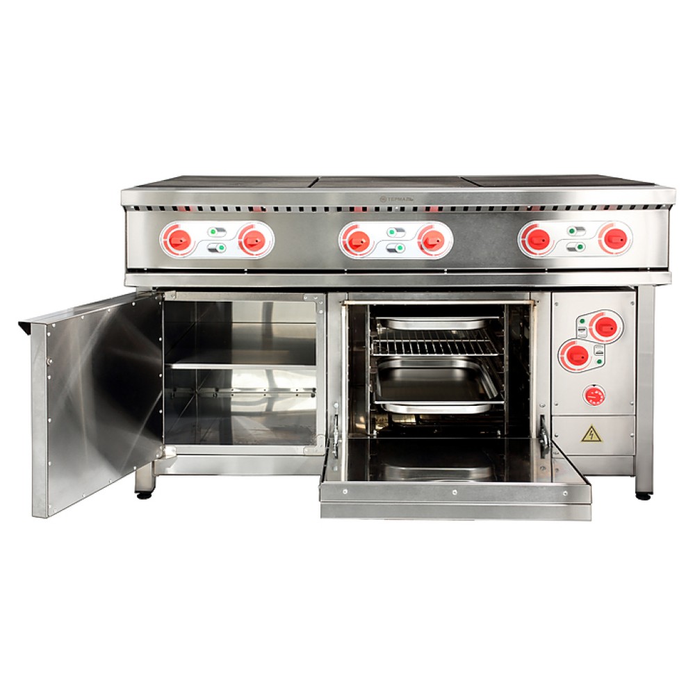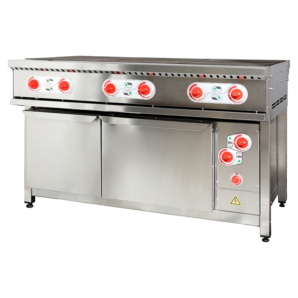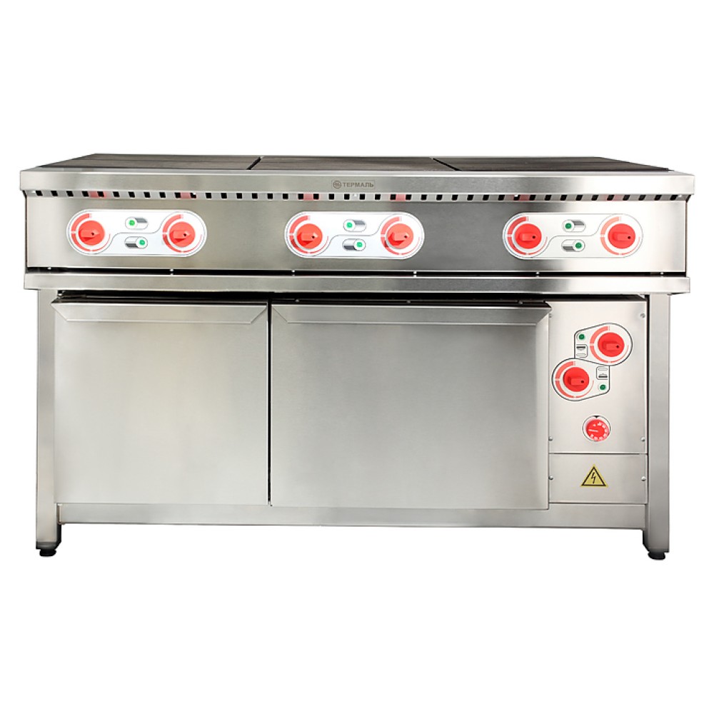 Плита электрическая Термаль ПЭ-6 ЖШ предназначена для приготовления различного вида блюд на предприятиях общественного питания и торговли. Контактные части и коммутационные провода защищены от попадания жидкости, благодаря чему обспечивается устойчивость к влажности. Прямоугольные легкосъемные цельнолитые конфорки гарантируют равномерный нагрев, в них также залиты ТЭНы, что предохраняет их от контакта с воздухом и, как следствие этого, от окисления.