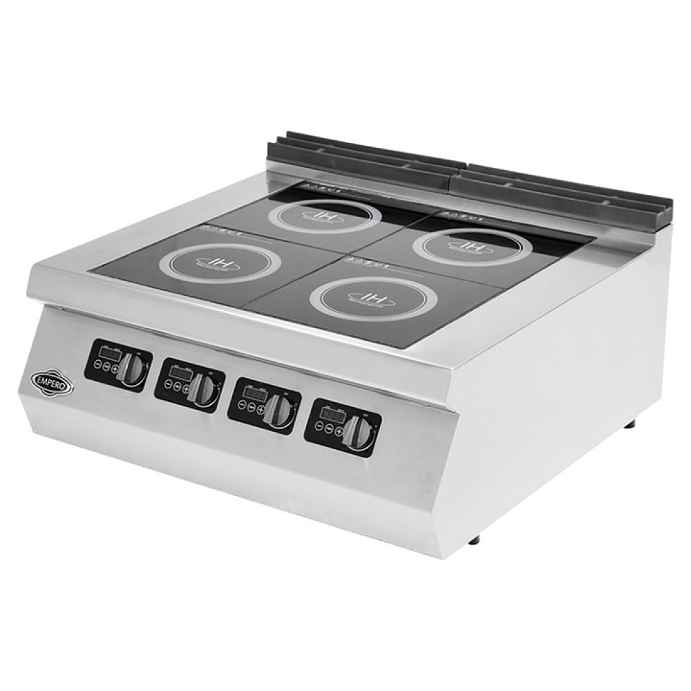 Настольная индукционная плита Empero EMP.PLS.7IND020 серии 700+ предназначена для приготовления большого ассортимента блюд на предприятиях пищевой промышленности, общественного питания и торговли. Принцип работы основан на непосредственном нагреве металлической посуды создаваемыми высокочастотным магнитным полем индуцированными вихревыми токами. Модель оснащена кабелем питания, рабочей поверхностью с 4 варочными зонами и расположенной на фронтальной наклонной стенке электромеханической панелью управления с 4 поворотными регуляторами, функциональными клавишами и 4 цифровыми дисплеями. Корпус выполнен из высококачественной нержавеющей стали, рабочая поверхность – из стекла черного цвета.