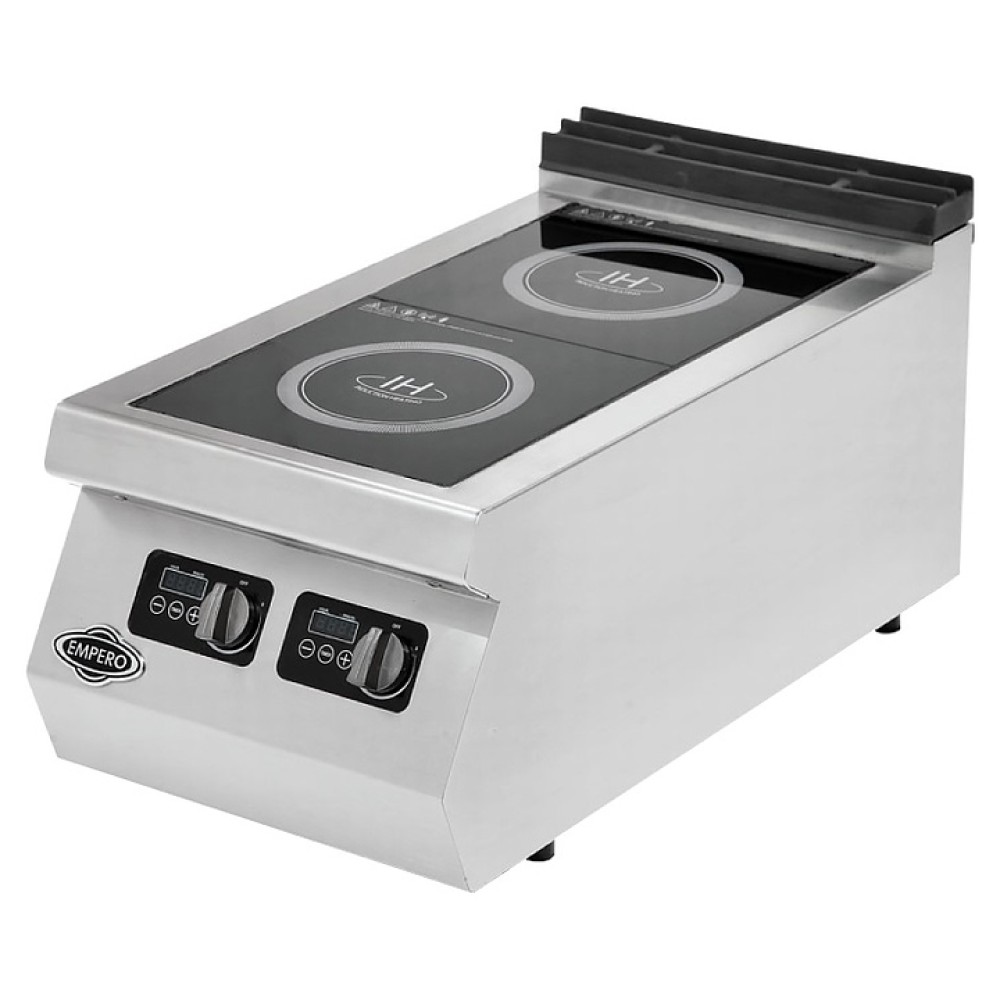 Настольная индукционная плита Empero EMP.PLS.9IND010 серии 900+ предназначена для приготовления большого ассортимента блюд на предприятиях пищевой промышленности, общественного питания и торговли. Принцип работы основан на непосредственном нагреве металлической посуды создаваемыми высокочастотным магнитным полем индуцированными вихревыми токами. Модель оснащена кабелем питания, рабочей поверхностью с 2 варочными зонами и расположенной на фронтальной наклонной стенке электромеханической панелью управления с 2 поворотными регуляторами, функциональными клавишами и 2 цифровыми дисплеями. Корпус выполнен из высококачественной нержавеющей стали, рабочая поверхность – из стекла черного цвета.