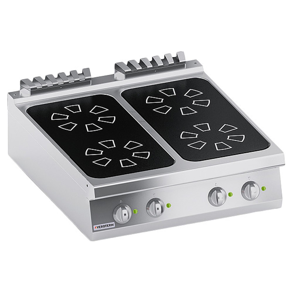 Настольная индукционная плита VEROTERM VT4CIEP10TT используется на предприятиях общественного питания и торговли для приготовления широкого ассортимента блюд в наплитной посуде. Принцип работы основан на непосредственном нагреве металлической посуды создаваемыми высокочастотным магнитным полем индуцированными вихревыми токами. Модель оснащена 4 варочными зонами, фронтальной электромеханической панелью управления и дисплеями индикации на рабочей поверхности. Корпус выполнен из нержавеющей стали AISI 430, рабочая поверхность – из высококачественной стеклокерамики черного цвета (Швейцария).