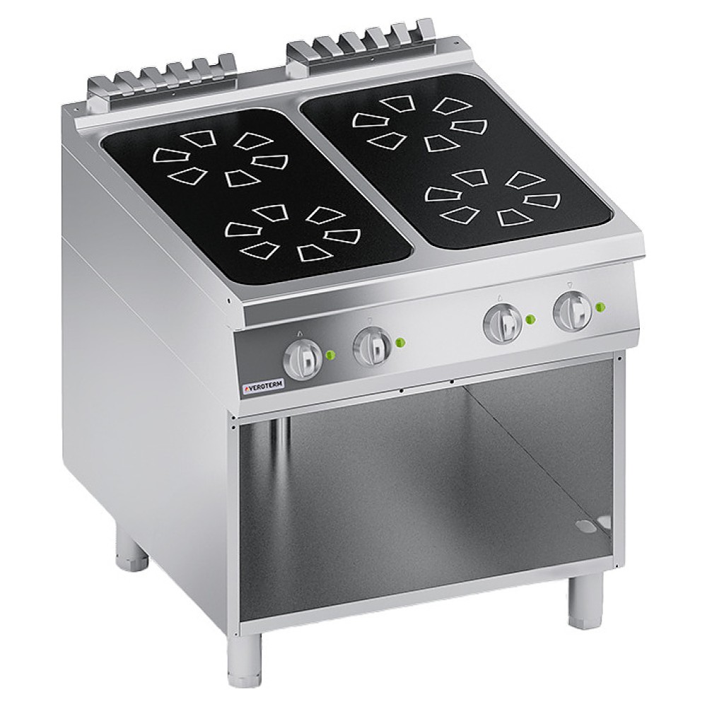 Напольная индукционная плита VEROTERM VT4CIEP10VV используется на предприятиях общественного питания и торговли для приготовления широкого ассортимента блюд в наплитной посуде. Принцип работы основан на непосредственном нагреве металлической посуды создаваемыми высокочастотным магнитным полем индуцированными вихревыми токами. Модель оснащена 4 варочными зонами, фронтальной электромеханической панелью управления и дисплеями индикации на рабочей поверхности. Корпус выполнен из нержавеющей стали AISI 430, рабочая поверхность – из высококачественной стеклокерамики черного цвета (Швейцария).