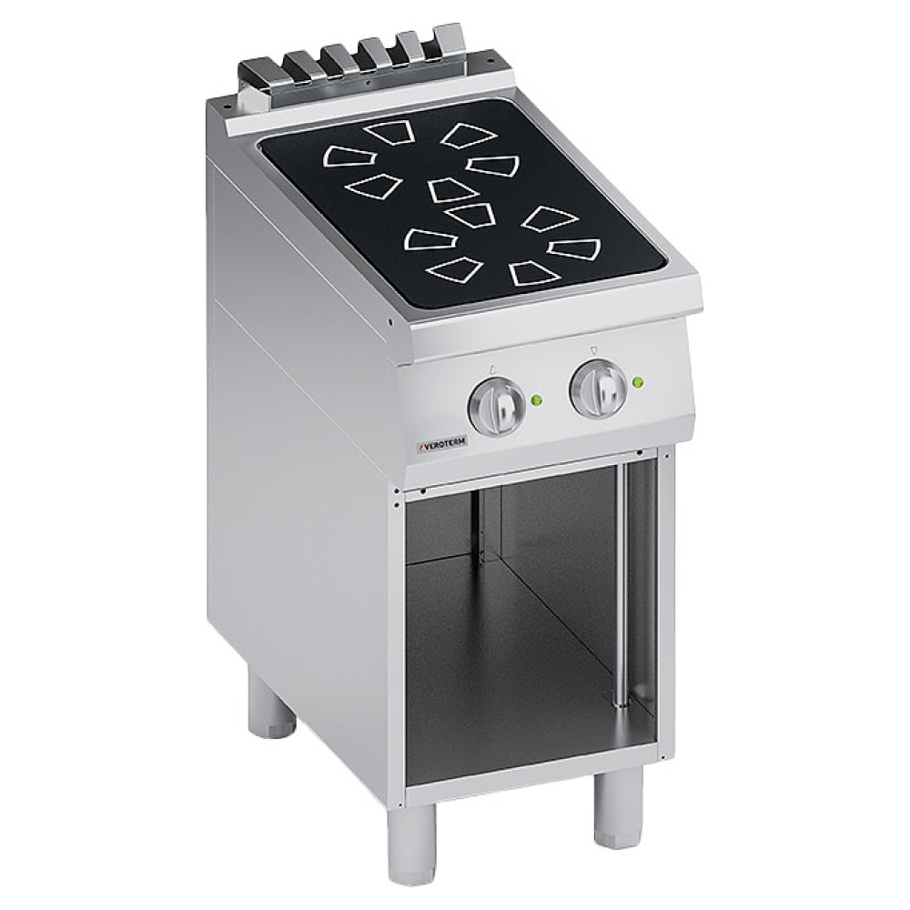 Напольная индукционная плита VEROTERM VT7CIE05VV используется на предприятиях общественного питания и торговли для приготовления широкого ассортимента блюд в наплитной посуде. Принцип работы основан на непосредственном нагреве металлической посуды создаваемыми высокочастотным магнитным полем индуцированными вихревыми токами. Модель оснащена 2 варочными зонами, фронтальной электромеханической панелью управления и дисплеями индикации на рабочей поверхности. Корпус выполнен из нержавеющей стали AISI 430, рабочая поверхность – из высококачественной стеклокерамики черного цвета (Швейцария).