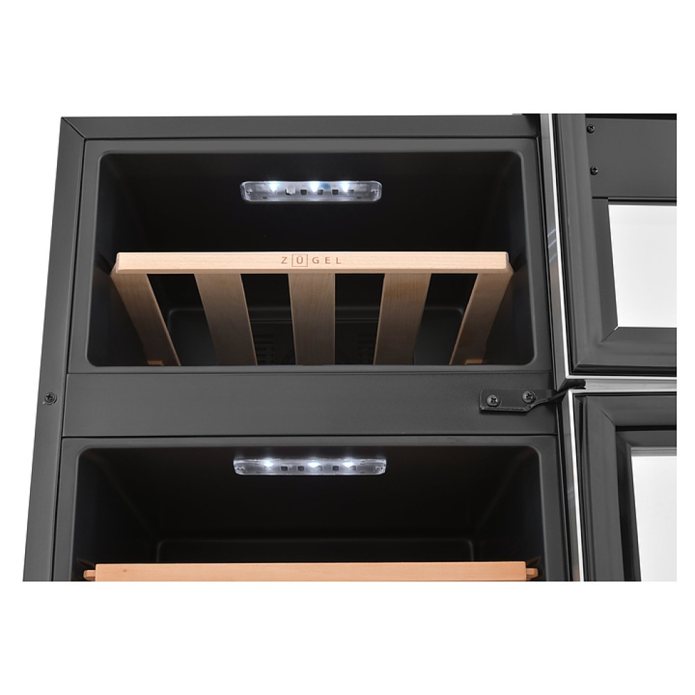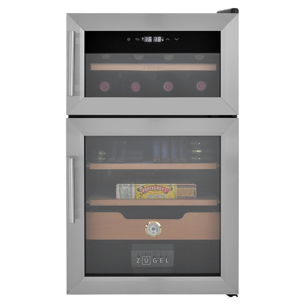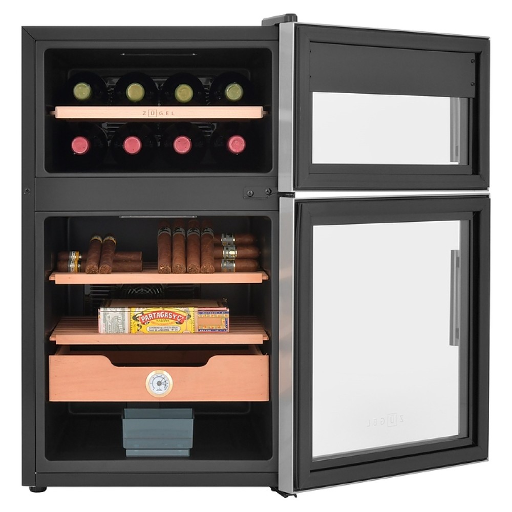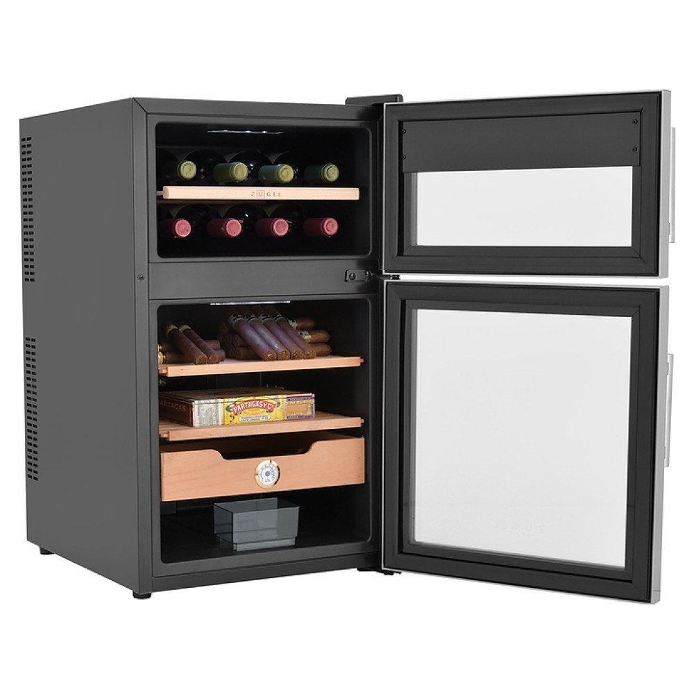 Винный шкаф - хьюмидор Zugel ZTH80DX предназначен для хранения при оптимальных условиях бутилированного вина различных сортов и табачных изделий в барах, ресторанах, специализированных магазинах, подсобных складских помещениях, а также домашних условиях. Модель оснащена 2 холодильными камерами: винной сверху и сигарной снизу, правосторонними распашными дверьми с вертикальными трубчатыми рукоятками и обзорным остеклением, интегрированными направляющими для полок, кабелем питания, расположенной на фасаде верхней двери электронной панелью управления с сенсорными функциональными клавишами и 2 цифровыми жидкокристаллическими дисплеями с белой подсветкой индикации. Корпус выполнен из металла с матовым антикоррозийным покрытием черного цвета, фронт рам дверей – из нержавеющей стали, рукоятки – из металла с серебристой поверхностью, внутренняя облицовка камер черного цвета, остекление – из тонированного закаленного стекла, полка винной камеры – из массива буковой древесины с фронтальной гравировкой логатипа, полки и ящик сигарной камеры – из древесины испанского кедра.