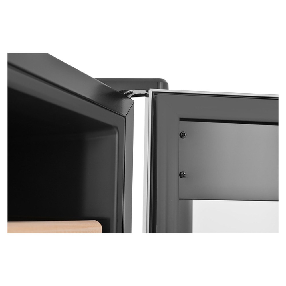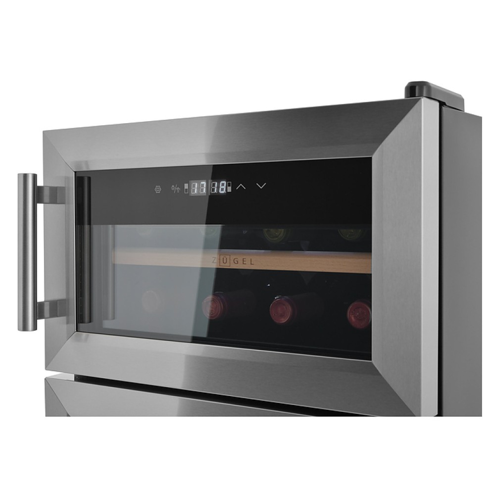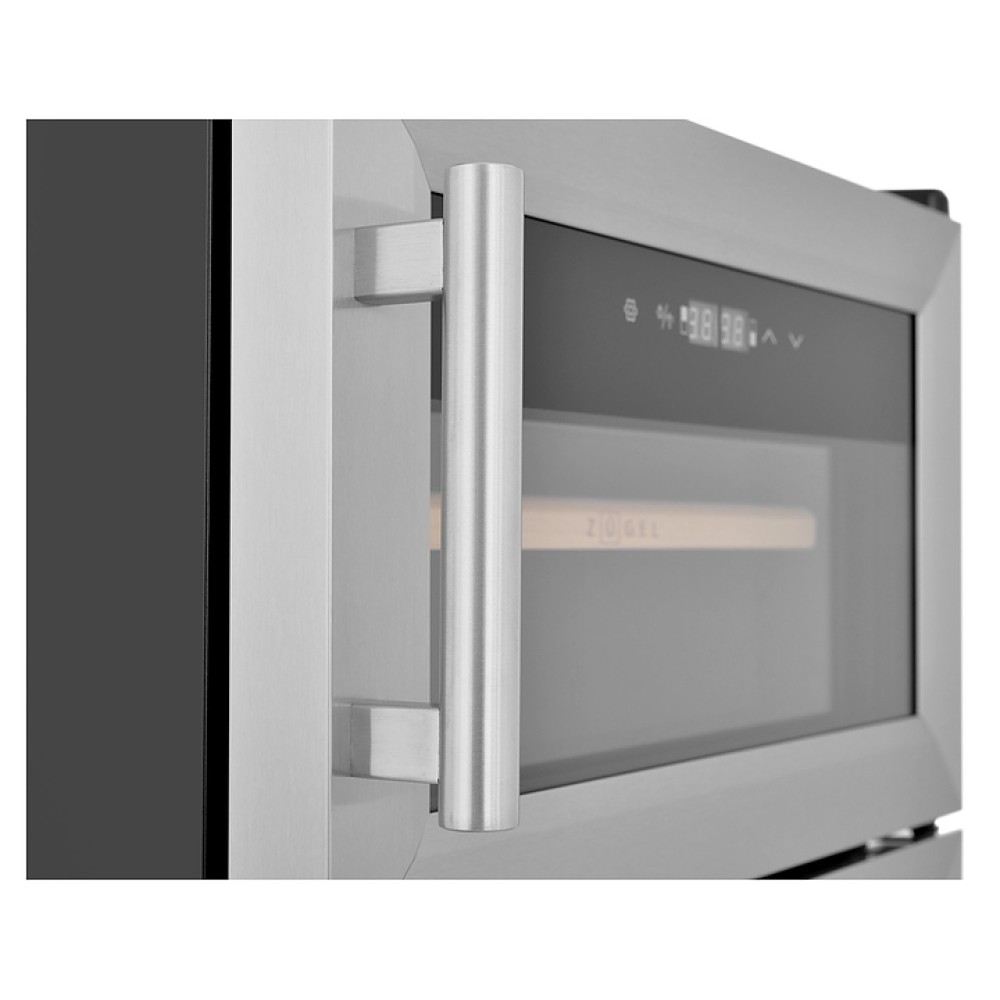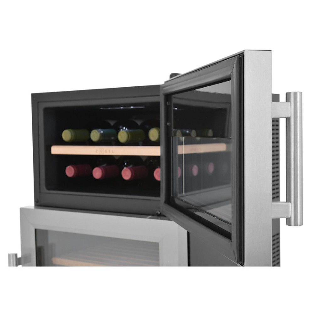 Винный шкаф - хьюмидор Zugel ZTH80DX предназначен для хранения при оптимальных условиях бутилированного вина различных сортов и табачных изделий в барах, ресторанах, специализированных магазинах, подсобных складских помещениях, а также домашних условиях. Модель оснащена 2 холодильными камерами: винной сверху и сигарной снизу, правосторонними распашными дверьми с вертикальными трубчатыми рукоятками и обзорным остеклением, интегрированными направляющими для полок, кабелем питания, расположенной на фасаде верхней двери электронной панелью управления с сенсорными функциональными клавишами и 2 цифровыми жидкокристаллическими дисплеями с белой подсветкой индикации. Корпус выполнен из металла с матовым антикоррозийным покрытием черного цвета, фронт рам дверей – из нержавеющей стали, рукоятки – из металла с серебристой поверхностью, внутренняя облицовка камер черного цвета, остекление – из тонированного закаленного стекла, полка винной камеры – из массива буковой древесины с фронтальной гравировкой логатипа, полки и ящик сигарной камеры – из древесины испанского кедра.
